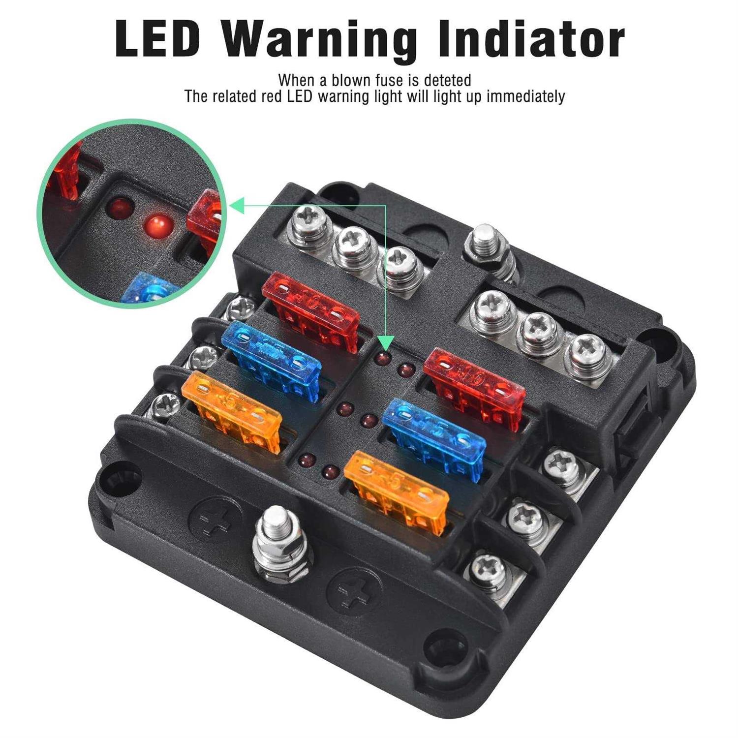 Quick Fix: Red LED warning light will light up immediately when the fuse is blown. It is very easy for you to check and replace the blown fuse. Safe & Superior Material: Made of environment fire-resist PBT material, this fuse block has high mechanical strength, good insulation, heat & flame resistance. It will hardly cause any issues like fracture, deformation, combustion or short circuit. Make Wiring Clean:6 Circuit Fuse Block is applied to ATC/ATO (Middle Size) fuses, every positive terminal screw has a negative one, Perfect solution for organizing and protecting a maze of low voltage circuit wiring in your vehicle. Loads Name Labels: Multifunctional DIY sticker for convenient examination & repair. You can easy to identify which appliance is going wrong. Max operating voltage: 32V DC; Max 30A per circuit & 100A per panel.