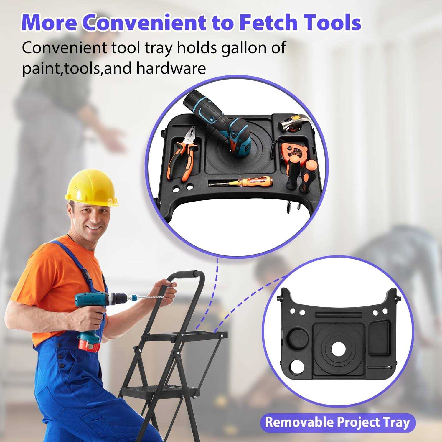 SUITABLE SIZE: 4 step ladder open size: 58.3″ x 31.7″ x 17.9″, folded size: 63.8″ x 14.2″, suitable for homes, kitchens, offices, garages and other places. The upgraded 4 step stool provides you with a perfect feeling of using. PORTABLE AND SPACE-SAVING: This Folding Step Stools comes fully assembled. Lock and open system for easily open and fold. Easy to transport and carry, suitable for indoor and outdoor use. NON-SLIP PROTECTION: The 4 step ladder has non-slip rubber handgrip making the stool easy to climb and carry. Wide pedals with non-slip rubber pattern offer heel-to-toe foot support. The thickened rubber ladder feet fully contact the ground and the comfortable rubber handgrip design enhances the safety and stability of the ladder. SECURITY AND STABILITY: High-grade steel frame is constructed with strength and reliability. Metal safe buckle automatically locks the stool in place keeping you safe when using it. The back cross brace structure reinforce the basic support which will make you feel more safe climbing up the step ladder. MULTIFUNCTIONAL USE: This folding step stool ladder with handrails is essential for any room, household, kitchen, library, pantry, office. The height is just right for cabinets, closets, and light cleaning. It is easy to carry around for multiple jobs, and is great for cleaning, painting, washing windows and so on. It acts as a chair or something to step on for small pets, a flower stand or a storage rack. Wider pedals provide more storage space. This step ladder is designed to simplify tasks that require you to reach higher areas safely. Its combination of anti-slip features, sturdy construction, and portability makes it a convenient tool for both indoor and outdoor applications.The sponge-covered handgrip gives you a soft feel and better friction. Also, it helps reduce accidental falls. The widened pedals with an anti-slip particle surface give full support to the feet for the safety and stability of the ladder. br br This Step Ladder is a well-designed and sturdy solution for all your indoor and outdoor height-related tasks. It’s an indispensable tool for everyday tasks like reaching high cabinets, organizing storage spaces, and performing maintenance chores. Its outdoor capabilities make it handy for gardening, cleaning gutters, and other projects. br br