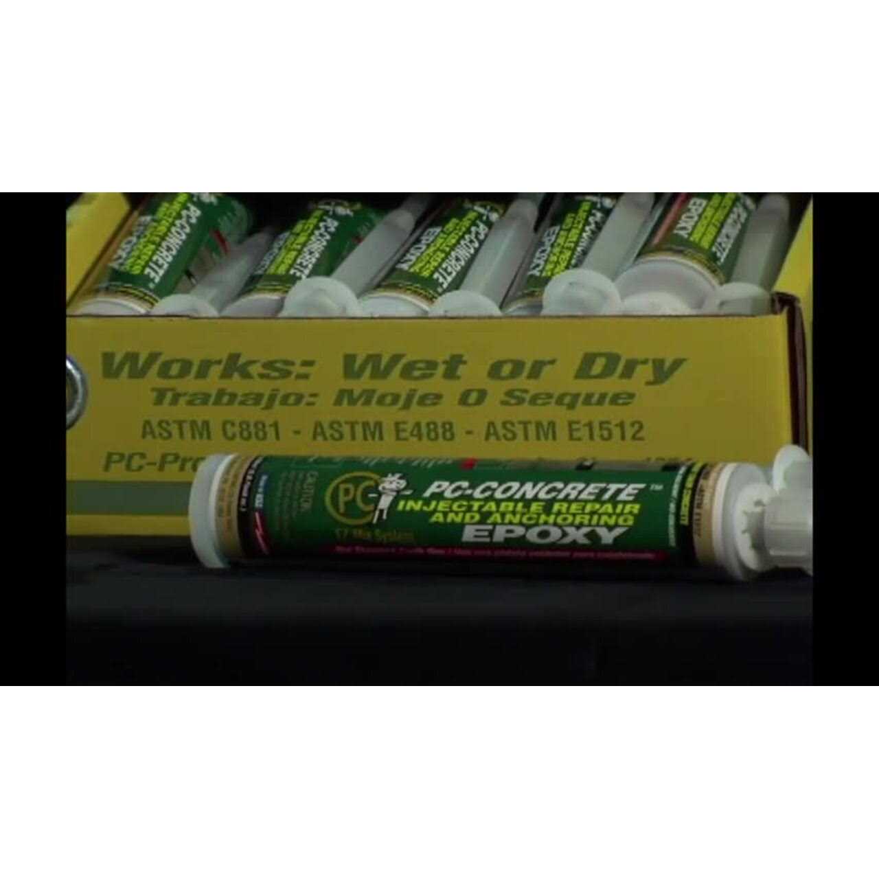 Pc-concrete is an injectable concrete anchoring & repair 2-component epoxy; 100% solids, high modulus, structural epoxy paste, solvent free, no odor, high strength, moisture insensitive, non-sag epoxy system, the 2 parts resin & hardener are uniformly dispersed from a cartridge system & mixed through a mixing nozzle, using a standard caulk gun to apply. Will perform effectively in vertical use situations to fill cracks, can be shaped & molded to rebuild missing areas of masonry. Will not shrink. Use for anchoring & setting pins & rods doweling as well as crack repair; bonds to metal, concrete, brick, wood, stone, block & most other substrates, 20 minutes, working time at 75 degrees f, 4 hour cure, 250 ml tube. PC-Concrete Epoxy Injectable Concrete Anchoring & Repair 2 Part Epoxy Solvent Free, No Odor Will not shrink Use in standard caulking gun Additional discounts apply for this item when purchased as Bulk.