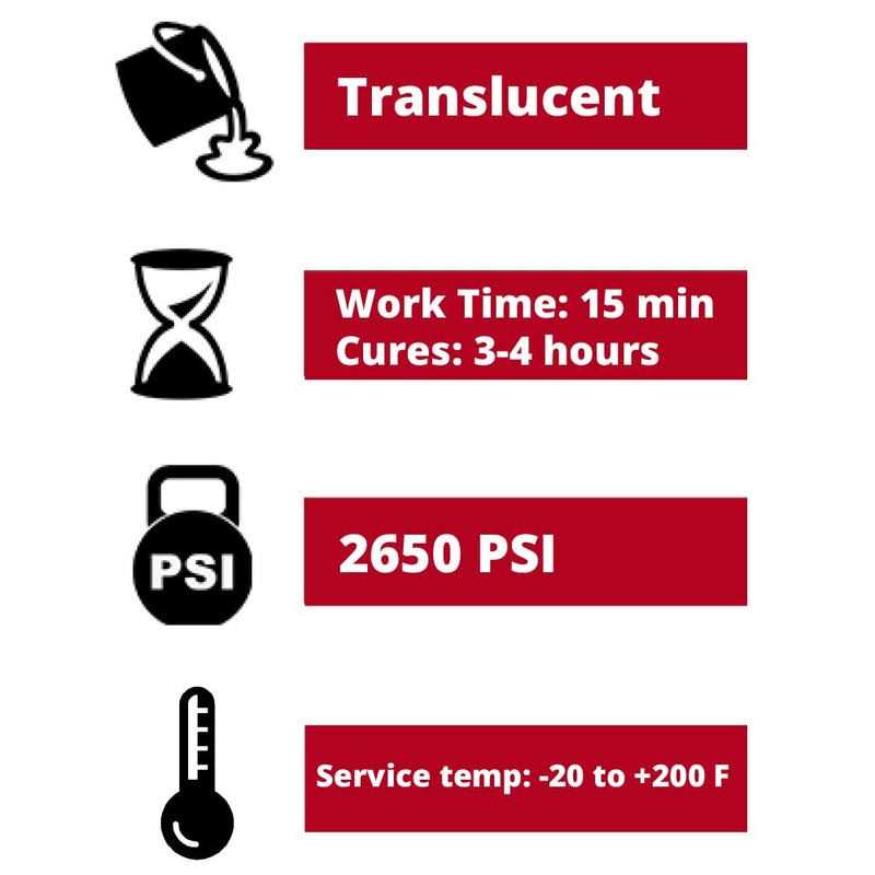 - Provides work time of 15 minutes, cure time for service of 3 to 4 hours, and full cure time of 3 to 7 days
