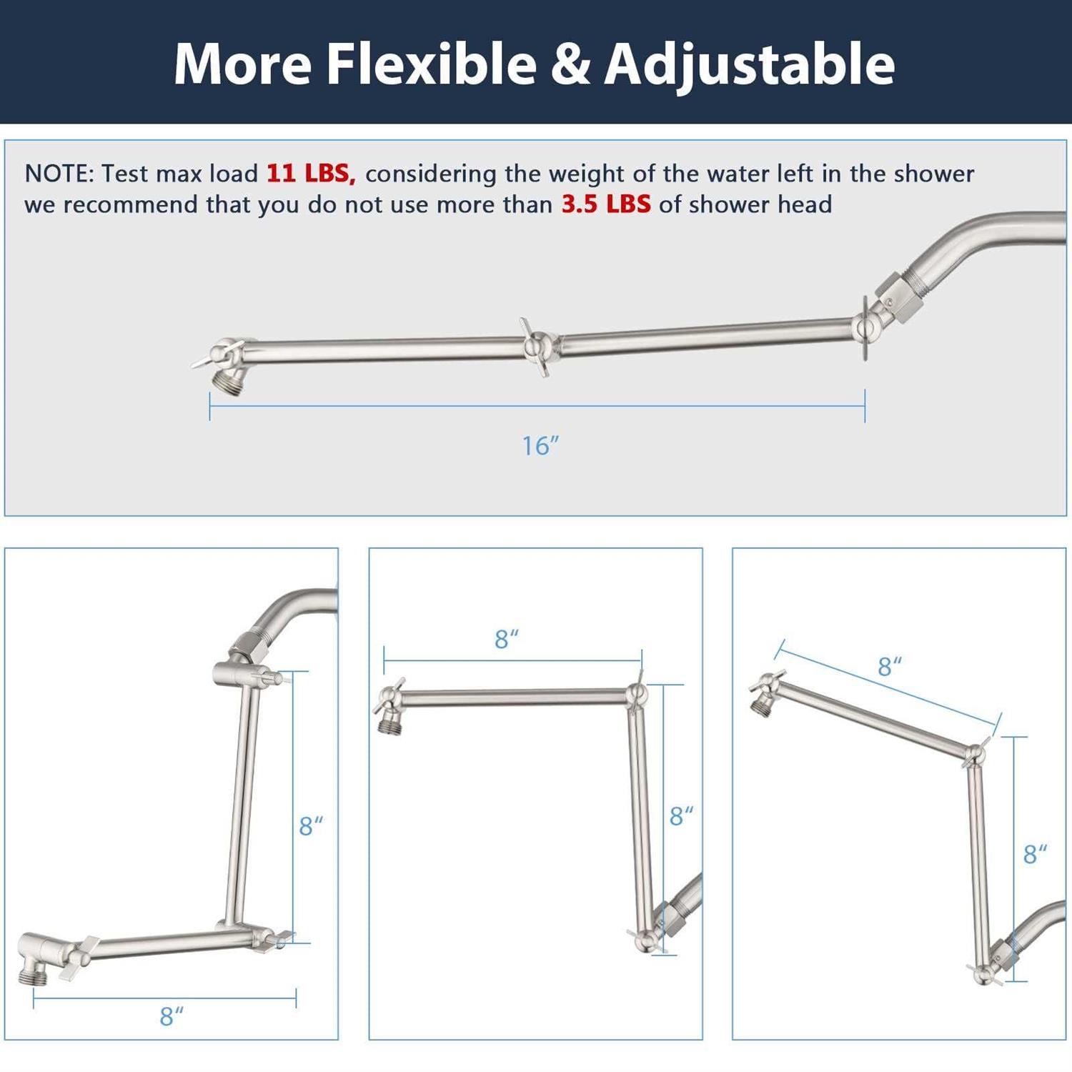CHOOSE SHOWER HEIGHT & DISTANCE – 16 inch shower arm extension can be rotate 360° at both ends, making it easy to raise low shower head on your new bathroom. lower the height of handheld shower head for easily reach by kid, elder and disable on shower chair, and extended distance from the wall for stop your elbow bumping the caddy or wall. SOLID BRASS – Made of sturdy brass with durable swivel joints that won’t crack. Easy-to-tighten handle grip with deep gear joint for keeping shower head perfectly on postion. Do not need to worry about dropping it. FREE SPINING NUT WITH 2 SET SCREW – The free spinning locking collar allows you to install the shower arm extender on perfect position, no need to spend lot washers to test you luck on built-in nut. 2 set screw easily fix on spinning nut which stop the extension arm from having 360 rotation. G1/2 UNIVERSAL CONNECTION – This shower arm extension meets US standard rain shower head and handheld shower head. It’s time to get rid of bad shower experience, update your shower system. EASY DIY PROJECT & LEAKING FIX KIT – No need plumber or handyman assist. Just install in a few minutes. Package with leaking fix kit. If leakage happens, you can easily fix leaking immediately with simply instruction and video.”