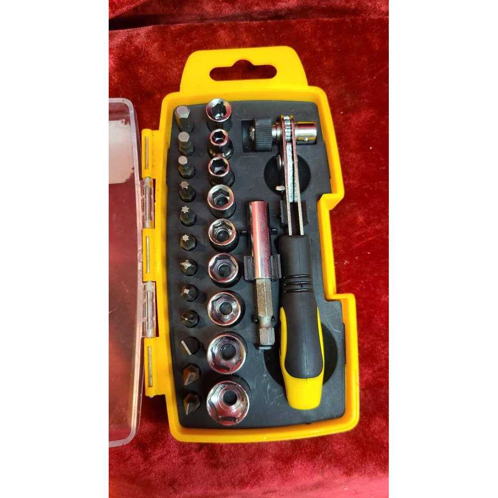 - Rubber cushion grip handle. Includes offset ratchet and driver, 1/4″ drive coupler, 2″ extension bar, 1/4″ dr. sockets and 12 assorted bits.