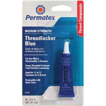All-purpose, medium strength threadlocker will lock and seal while preventing parts from loosening due to vibration Gel Twist Applicator provides accurate dispensing, putting the threadlocker where you want it Gel formula provides ‘liquid-reliability’ without drips, globs, mess or waste, allowing for easy overhead and vertical applications Ideal for all nut and bolt applications 1/4 inch to 1 inch (6mm to 25mm) Suggested Applications: Valve cover bolts, water pump bolts, oil pan bolts, drive shaft bolts, rocker arm adjustment nuts, carburetor studs Permatex Medium Strength Blue Threadlockers Medium-strength threadlocker. Ideal for all nut and bolt applications 1/4 in to 3/4 in (6mm to 20mm). Locks and seals while preventing parts from loosening due to vibration. Protects threads from corrosion.