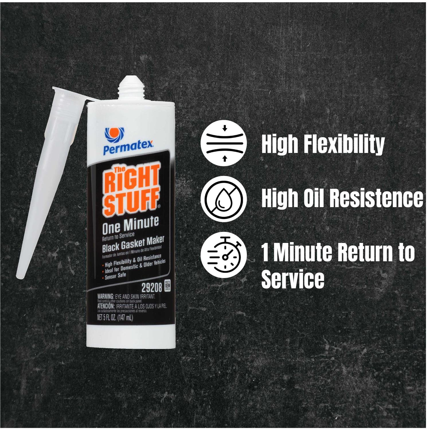 Permatex The Right Stuff 1 Minute Series offers the fastest return to service in just 1 minute! This leak-proof, elastomeric ‘formed-in-place’ material is more reliable and longer lasting than pre-cut gaskets. It is blowout resistant and protects against leaks and seepage caused by vibration and thermal expansion. The Right Stuff Black 1 Minute is designed for high-flexible, high oil resistance applications and is formulated to meet or exceed performance standards for long-term sealability, durability and handling.