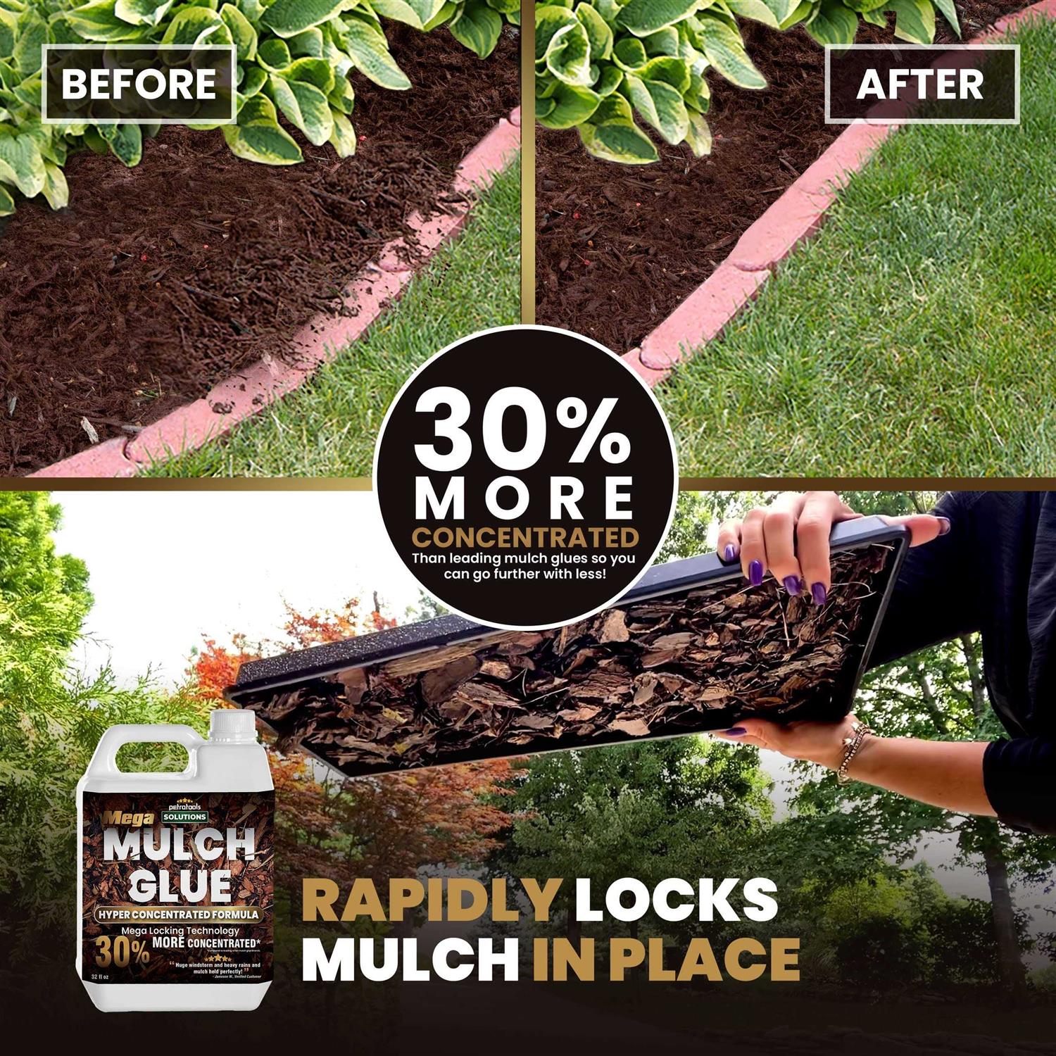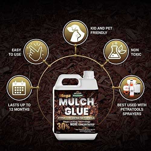 SUPERIOR MULCH BINDER: Our landscape glue powerfully holds mulch, wood chips, shells, sand, pine straw, small pebbles, hay and straw, small gravel, and leaf piles in place. PetraTool Mega Mulch Glue doesn’t only work on light and soft materials but also hard and heavy ones like gravel and pebbles.