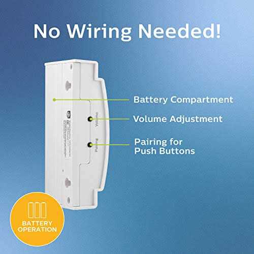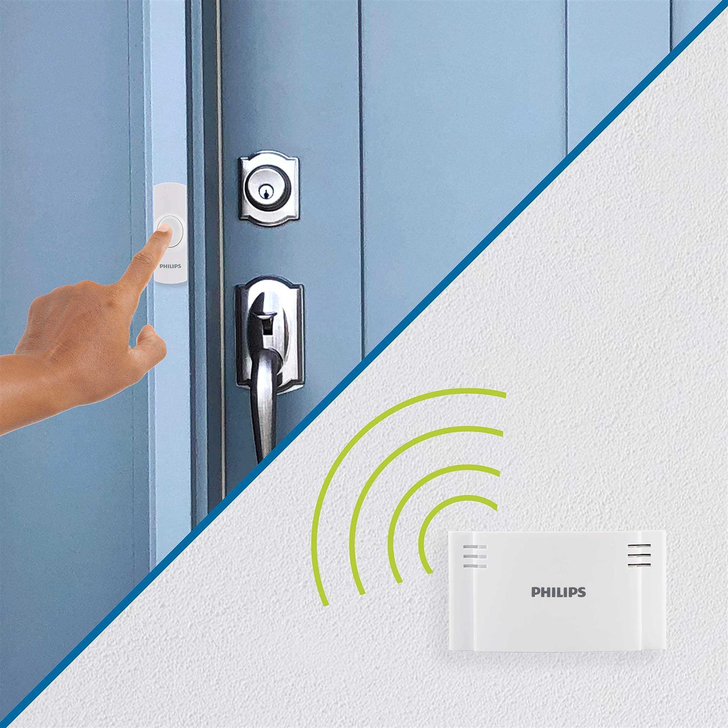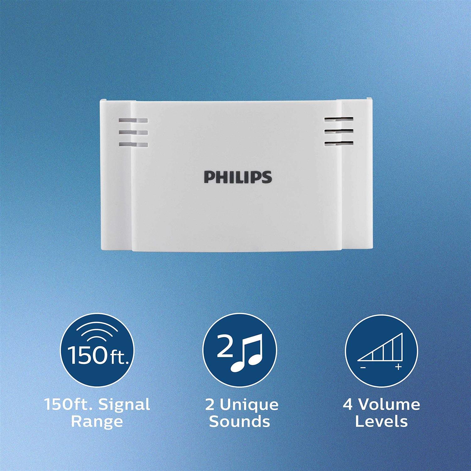 Enhance your entryway with a Philips Battery-Operated 2-Melody Doorbell Kit. The battery-operated doorbell pairs with up to four wireless push buttons and features two melodies (ding dong and Westminster) to customize multiple entryways with separate sounds. For additional personalization, adjust the sound level using four volume settings. The push button comes already paired with the receiver. Mounting instructions are included for both the push button and receiver, which operates using three AA batteries (not included). The wireless setup, provided mounting hardware and up to a 150ft. range make installation of the doorbell kit a breeze. The white finish allows the doorbell and button to integrate into any dcor. With a Philips Battery-Operated 2-Melody Doorbell Kit, youll never miss a guest.