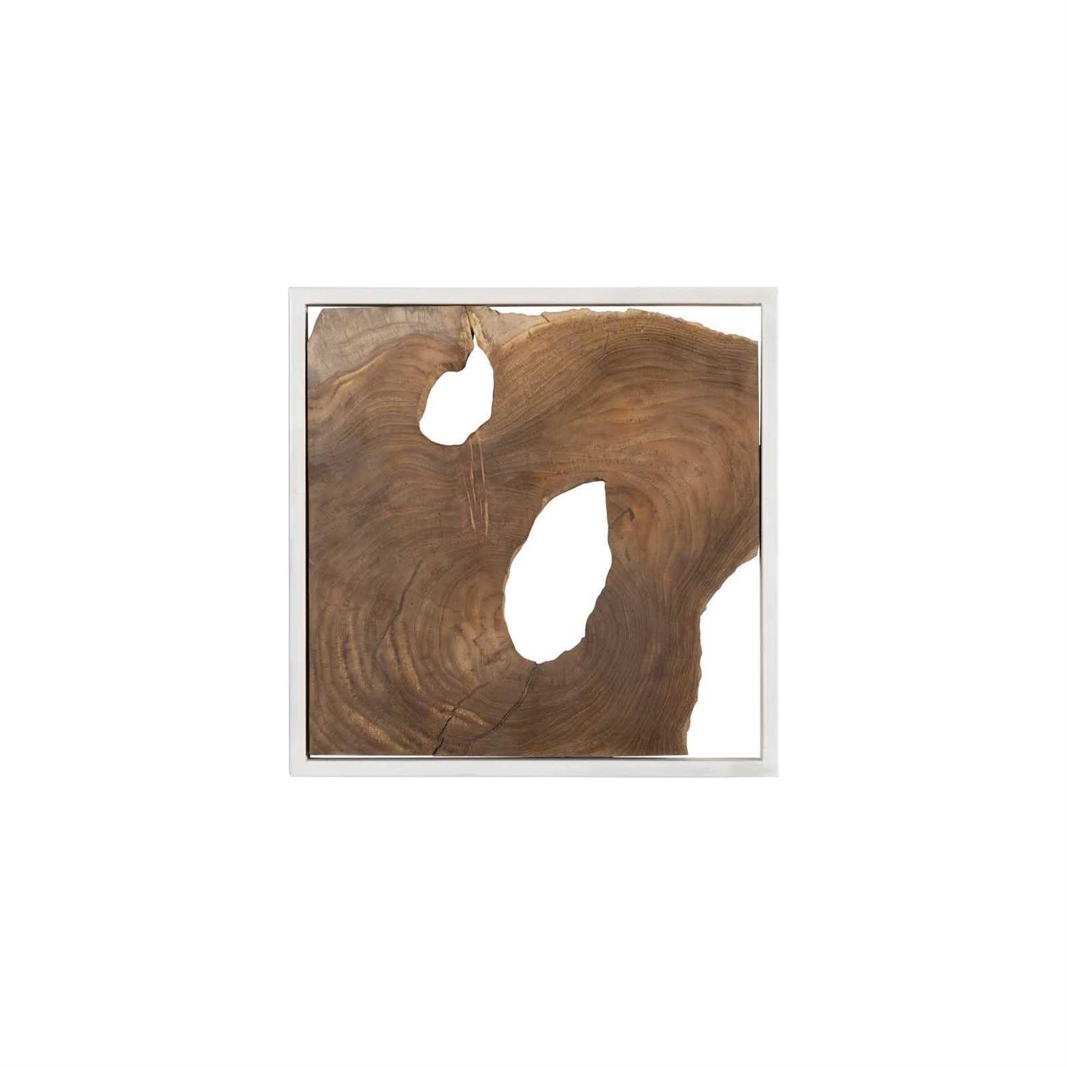 This White Framed Slice Wall Tile features a slice of teak wood, highlighting the warm tones and textural grain. Choose from a variety of frame colors to match your modern organic decor. Perfect for home or office. Dimensions: N/A.