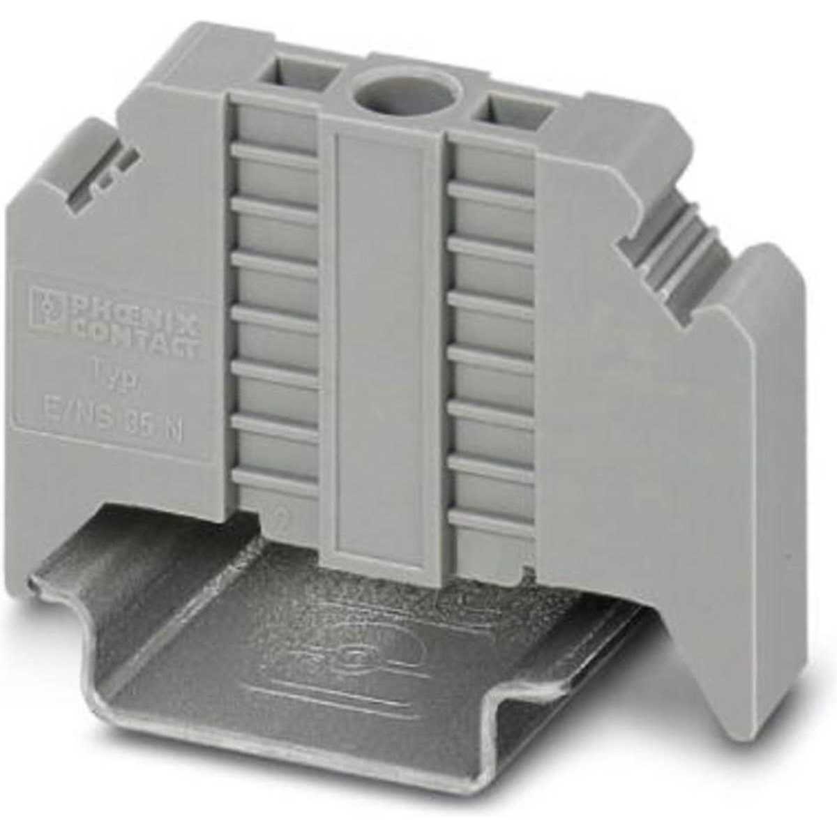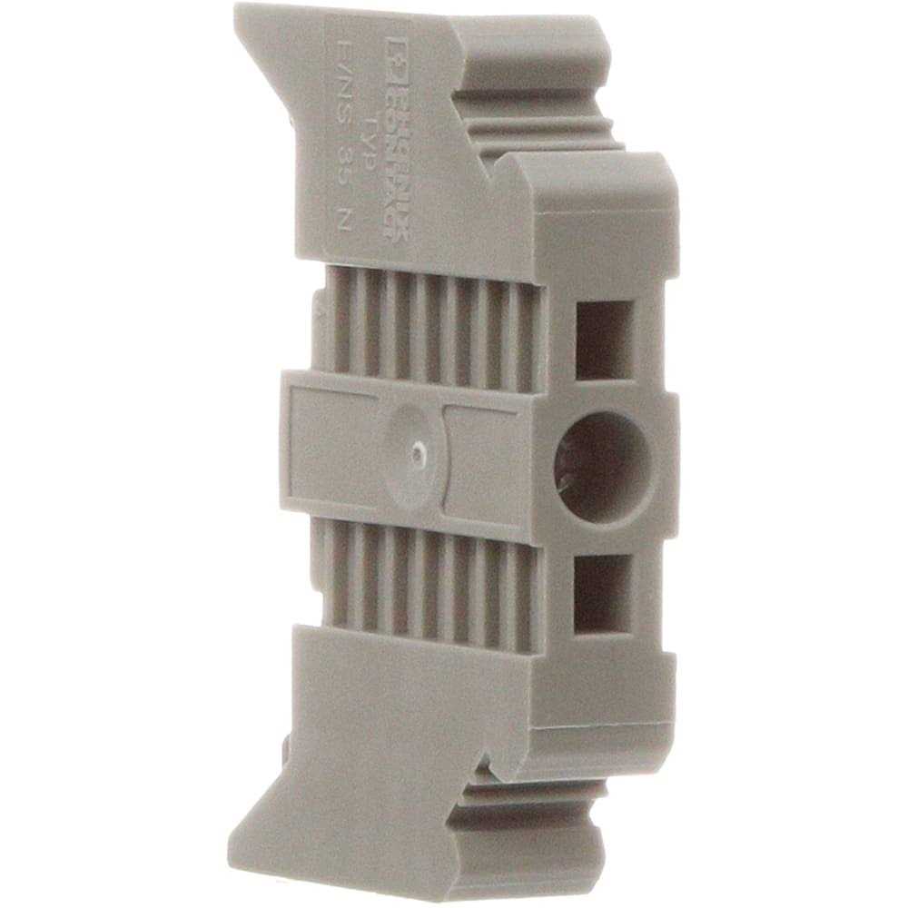 EAN 4017918129309 manufacturer number E NS35N End bracket for terminal block plastic Colour Grey, Mounting method DIN rail top hat rail 35 mm, Type of latching Other, Material Plastic, Inflammability class of insulation material acc. with UL94 V2, Width grid dimension 9,5mm, Height at lowest possible mounting height 34,3mm, Length 48,6mm E NS 35 N