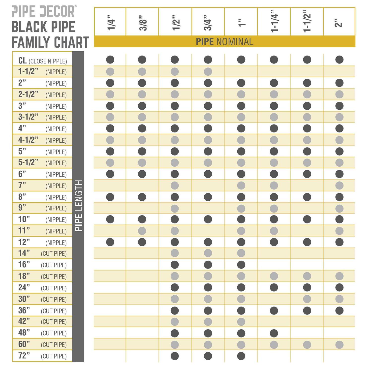 Black Pipe- PIPE DECOR pre-cut pipe can be used for either plumbing or decor installations. This is genuine schedule 40 black steel pipe that has been hydrostatically tested and is ASTM and ASME compliant. Each pipe comes pre-threaded, is free of any stickers, and comes coated in a light industrial oil to prevent rusting. Ideal for pipe decor, or use in standard gas, air, and liquid propane applications. Quality industrial black steel complements any aesthetic. IPS threads offer compatibility with other project materials such as lamp parts, valves, and more. Our PIPE DECOR line contains an array of fittings and connectors to create a variety of projects. Build your own or use with our pipe kits to achieve a custom look. Pipe will require cleaning and sealing prior to use. Authentic black steel gives your furniture a modern, industrial look Pipe is 100% schedule 40 black steel Can be used for plumbing applications in air, natural gas, and liquid propane, in addition to home décor Clean and seal instructions included Hydrostatically tested Meets all applicable ASTM & ASME standards; UL- & FM-listed Compatible with any pipes, fittings, and PIPE DECOR furniture kits of the same diameter PIPE, PIPE DECOR, 1 1/2 in. x 10 in. Black Pipe, pipes, steel pipes, black pipes, black steel pipes, piping, steel piping, black steel piping