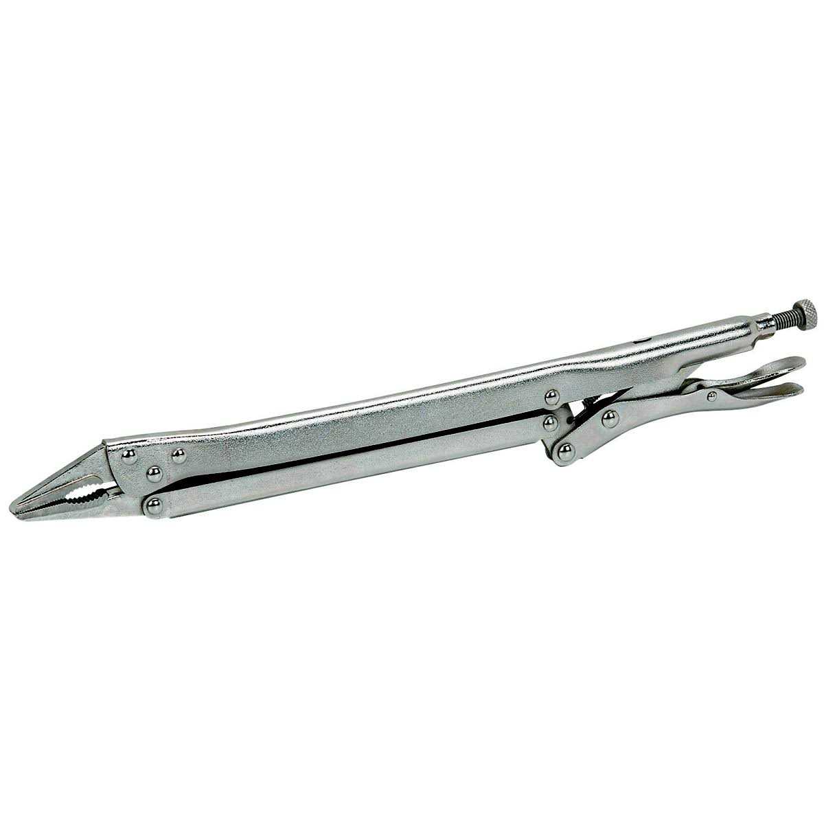 These handy long reach locking pliers easily reach into tight spots that conventional pliers won’t. Long nose jaws grip tiny objects and are ideal for tightening, clamping, twisting and turning. Constructed of durable high carbon steel with a zinc-plated finish to resist rust and corrosion.