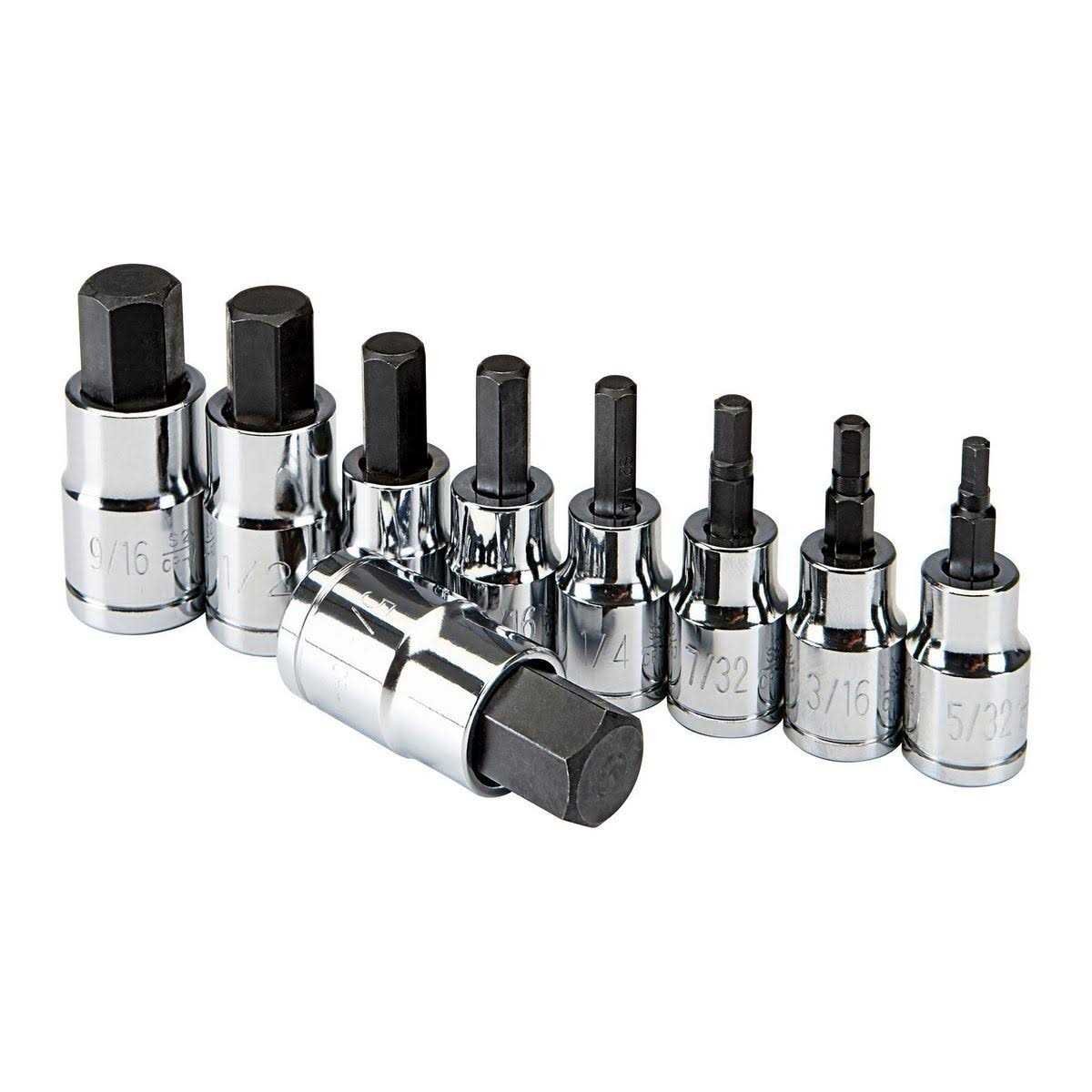 The hex bit socket set features high visibility markings for easy size identification and a chrome vanadium steel construction to withstand heavy use.