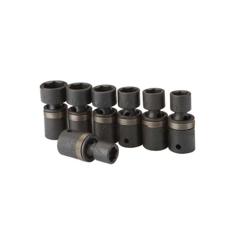 These impact sockets are constructed out of tough chrome vanadium steel to withstand the high-force of impact drivers. The swivel base in each piece in this impact socket set allows you to get to work at hard-to-reach angles when working on transmissions, suspensions and exhaust systems. Each socket is coated with black phosphate to fight off rust and is clearly labeled so you can quickly identify socket sizes.