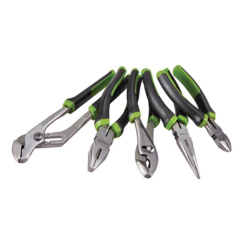 The, 5 Piece Pliers Set includes pliers for all types of jobs. This set of pliers is constructed of heavy duty forged and hardened steel with a polished finish. Comfort grips for a non-slip hold.