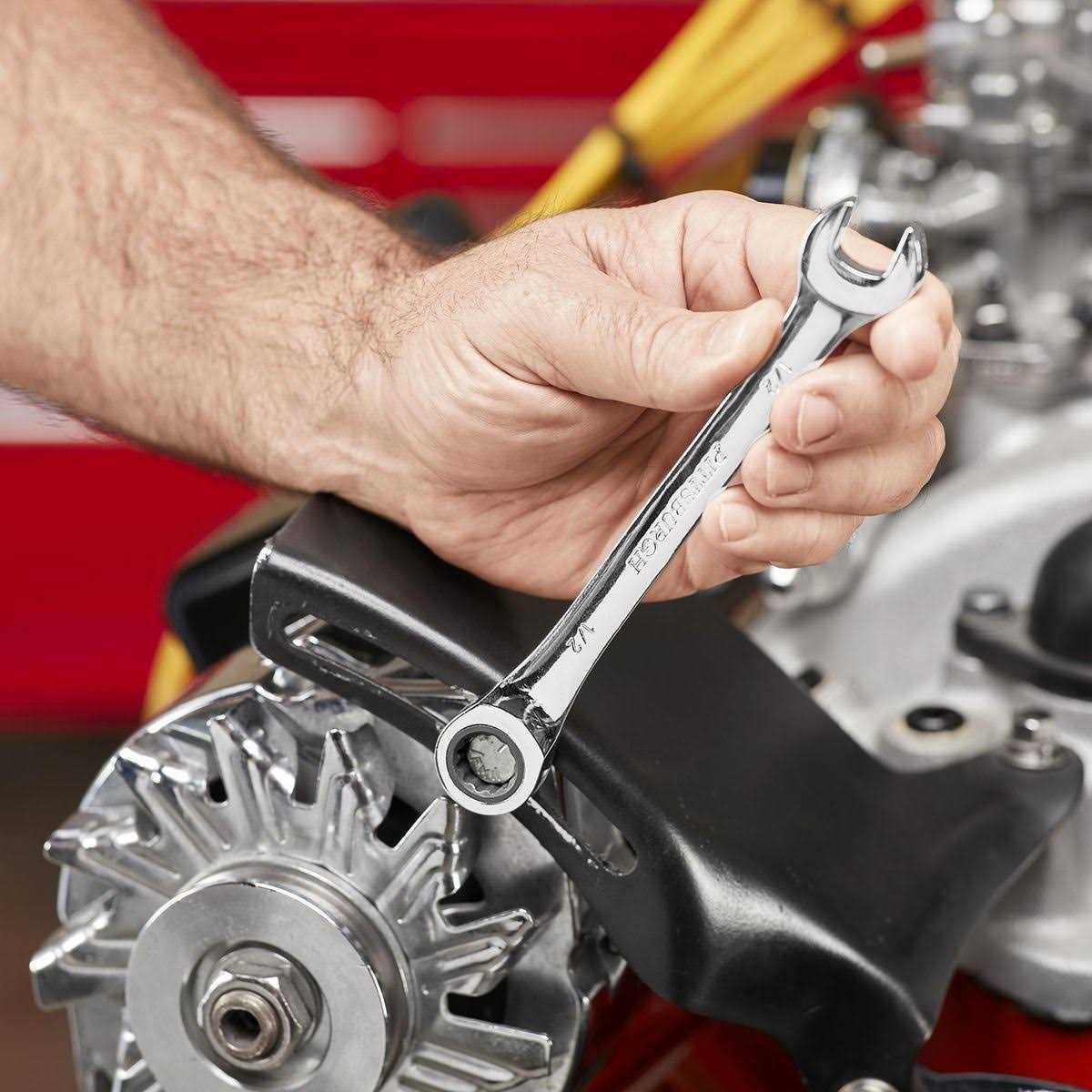 Made of durable chrome vanadium steel, this ratcheting combination wrench set has a generous 5 degree arc swing for working in tight areas. The fixed side features a 15 deg. offset head for better access. The wrench set comes with a custom storage case to keep your wrenches organized.