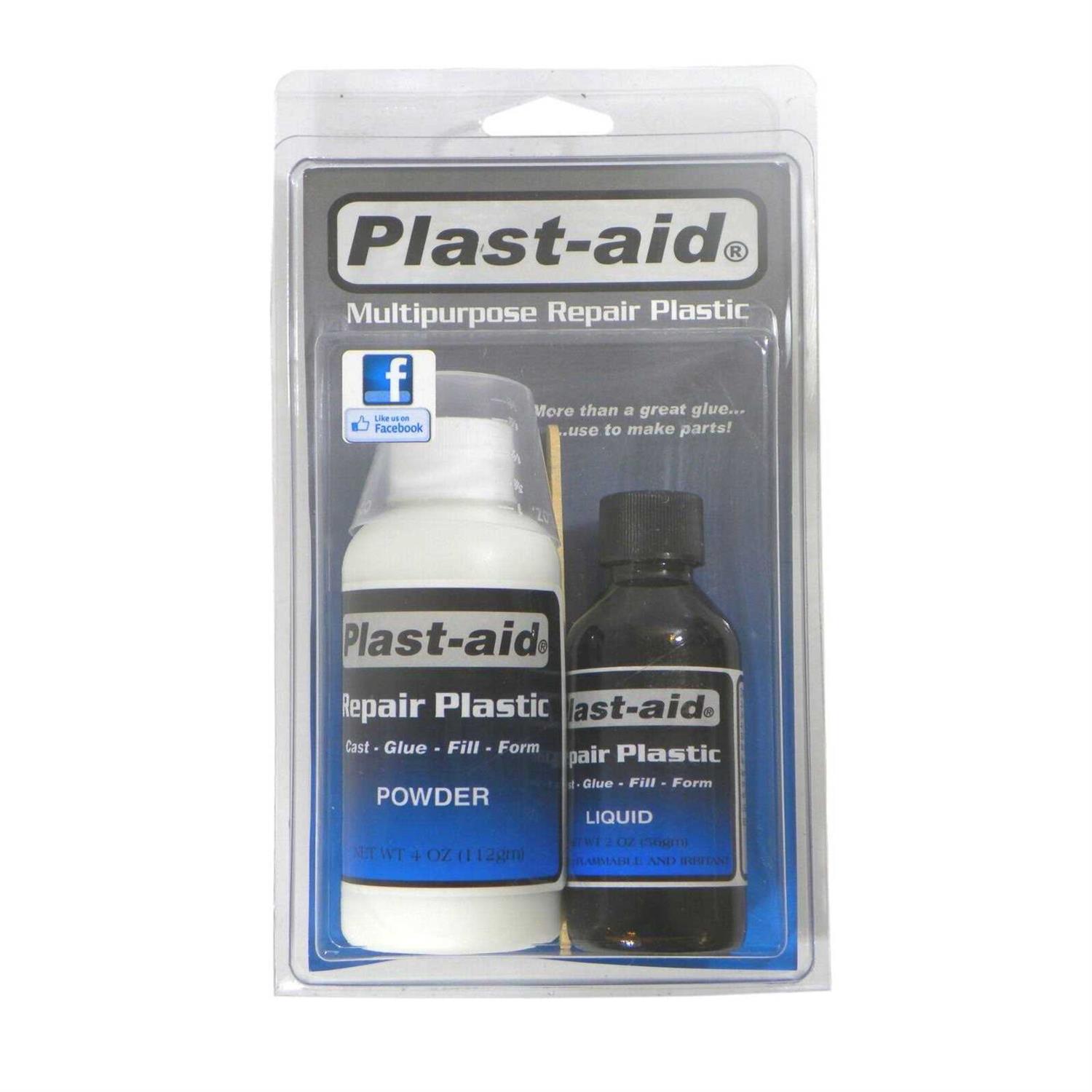 Plast-aid forms a strong, waterproof, durable plastic with thousands of uses in about 15 minutes. As it cures, it changes consistency to be used to cast, glue, fill and form. It chemically fuses to many plastics such as ABS, acrylic, and PVC, and those which become sticky after testing with a drop of Plast-aid liquid. Will not bond to all plastics such as polyethylene or nylon. Plast-aid mechanically bonds to rough surfaces such as wood, stone, and concrete.