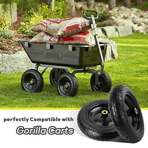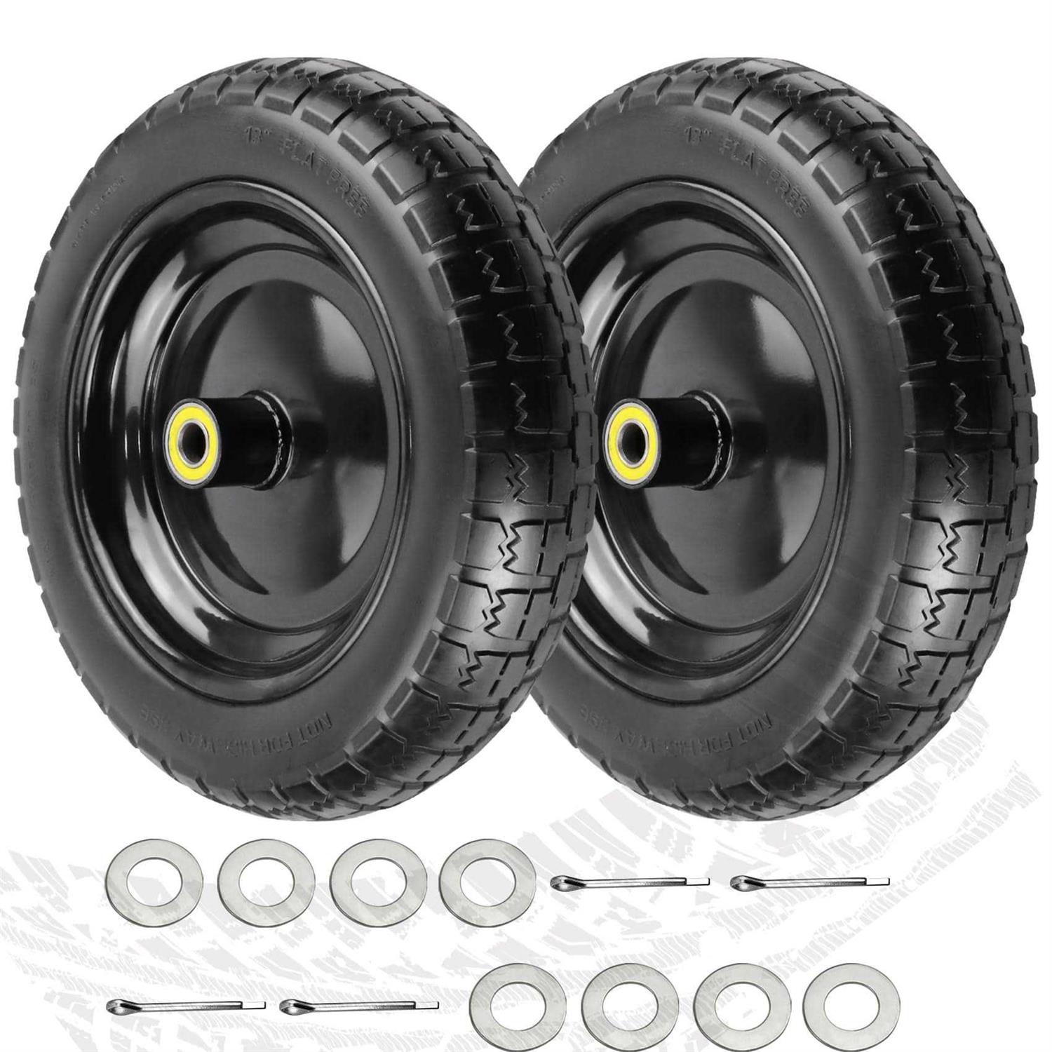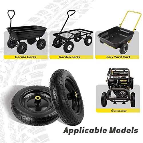 Perfect replacement for GOR garden cart tires: Are you still troubled by frequent inflation or blowout of pneumatic tires? This 13″” flat free tires can completely solve your troubles, help you easily complete the handling work, say goodbye to tire explosion and inflation, save your time and money. Universal compatibility:5/8′′ ball bearing,2.17″” hub length, 13″” flat free wheels have a wide range of applicability. 13 inches no flat tires are perfect replacement for GOR garden cart wheels. It is also suitable for lawn carts, generators. The shock absorption effect are better than the general 13″” solid wheels. Premium quality: The 13 inches solid tires are made of high-quality steel rims and durable polyurethane, which has excellent impact resistance and load-bearing capacity. It lasts 2-3 years longer than ordinary tires. 13′′ flat free garden carts wheels equipped with four additional sets of spacers and pins to make your tires more stable. Excellent design: Bearings are designed with rubber dust pads to protect them from dust and water vapor. The13′′ garden cart replacement tires have an upgraded tire surface design that greatly increases its friction and skid resistance, making it suitable for various terrains. Perfect replacement for gorilla cart tires: Are you still troubled by frequent inflation or blowout of pneumatic tires? This 13″” flat free gorilla cart tires replacement can completely solve your troubles, help you easily complete the handling work, say goodbye to tire explosion and inflation, save your time and money. Universal compatibility: 5/8′′ ball bearing,2.17″” hub length, 13″” Solid gorilla cart wheels replacement have a wide range of applicability. 13 inches no flat gorilla cart tires replacement are perfect replacement for gorilla cart wheels. It is also suitable for garden carts, lawn carts, generators,poly dump carts. The shock absorption effect are better than the general 13″” solid wheels. Premium quality: The 13 inches gorilla cart replacement wheels are made of high-quality steel rims and durable polyurethane, which has excellent impact resistance and load-bearing capacity. It lasts 2-3 years longer than ordinary tires. 13′′ flat free wheels equipped with four additional sets of spacers and pins to make your tires more stable. Excellent design: Bearings are designed with rubber dust pads to protect them from dust and water vapor. The garden cart replacement tires have an upgraded tire surface design that greatly increases its friction and skid resistance, making it suitable for various terrains.”