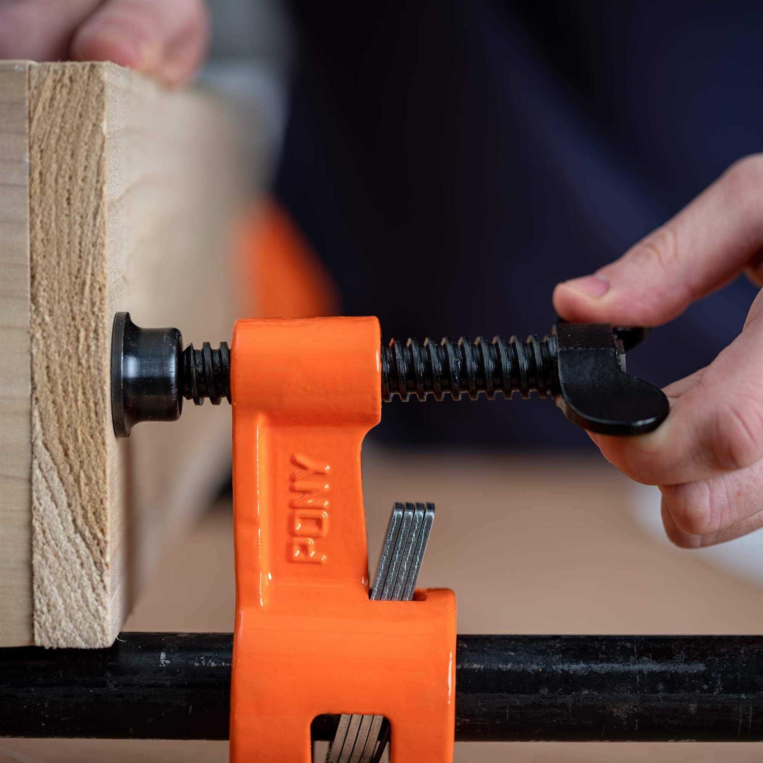 Pony Jorgensen’s deep reach pipe clamp fixture features a reach of 76mm. Reverse the heads to easily turn it into a spreader clamp. Ideal for use in tight quarters. These deep reach clamps work more like a F style clamp rather than the traditional pipe clamp. This allows for the jaws to remain more rigid and parallel when they are tightened. The benefit ofpipeclampsis that there is no limit to how long you can make them. As long as you have a length of pipe long enough, they can be made that length. This also means you can keep a few sets of clamp heads and have a selection of pipe that can be swapped out as needed depending on the project. They are the most cost effective clamp option on the market. Does not include pole. Clamp fixtures only. Please note that there is a spring in the packaging that is needed for the pipe clamp to work. Please do not throw out. Features a special deep-reach head, which allows you to micro-adjust your tightness from the outboard end of your clamp The design is perfect for tight jobs where traditional pipe clamps may not work Fixed head can be reversed and clamp can be used as a spreader Sliding head operates smoothly with the 5/8 adjusting screw for final tightening Fixed head can be reversed and clamp can be used as a spreader Sliding head operates smoothly with the 5/8 adjusting screw for final tightening Multiple-Disc-Clutch for secure hold along pipe Coil spring stop Pony Jorgensen provides Craftspeople, Makers and DIYers with clamps that are not only well made and durable & they are also designed to be versatile and easy to use. Embrace your creativity and choose Pony Jorgensen.
