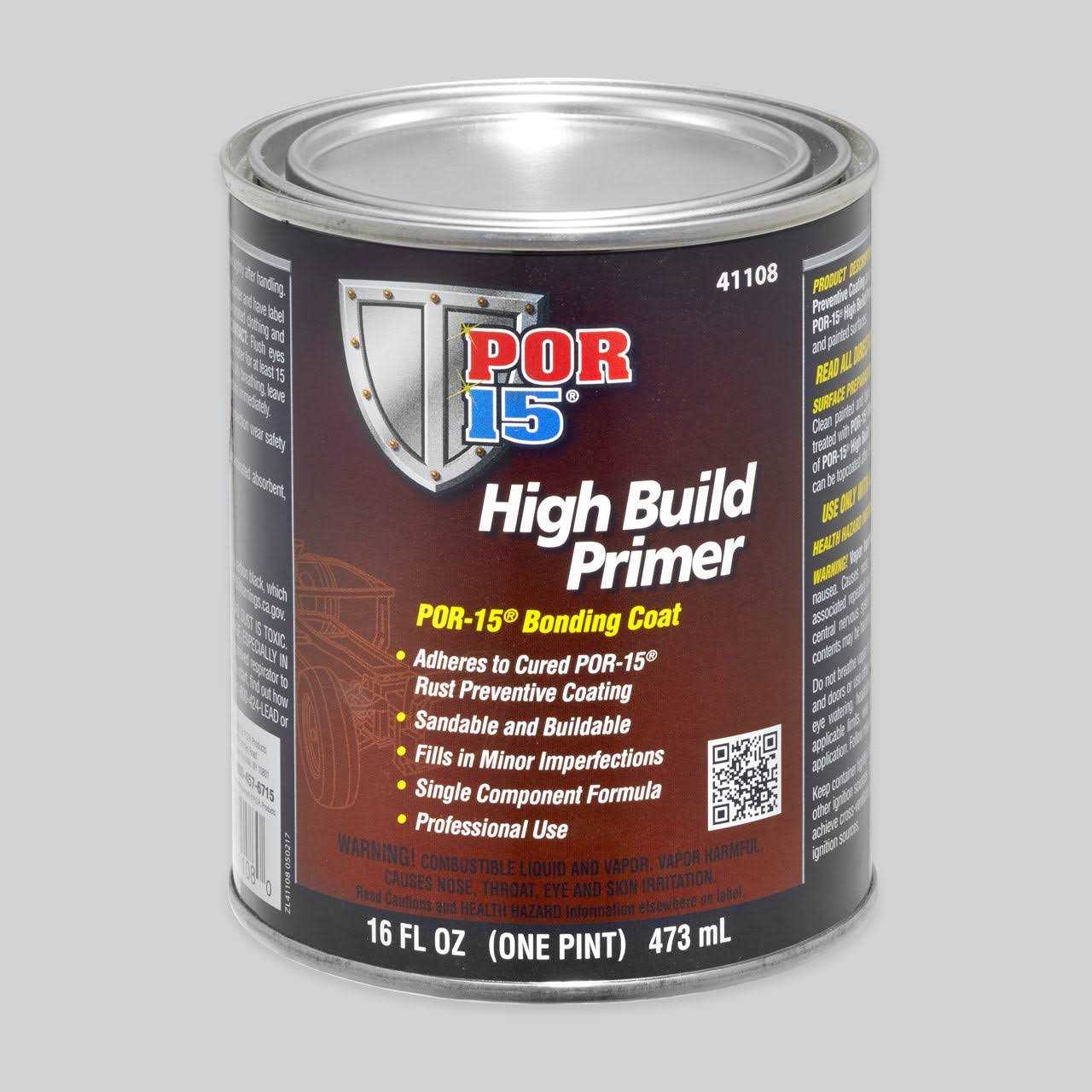 POR-15 High Build Primer provides sandable and buildable coating that can be applied over cured POR-15 Rust Preventive Coating and all POR-15 topcoats to enable quick refinishing and recoating of these products. POR-15 High Build Primer is a single component formula that fills in minor Imperfections. POR-15 High Build Primer adheres well to steel, aluminum, stainless steel, brass, and other primed and painted surfaces. POR-15 High Build Primer is highly resistant to penetrating topcoats, like lacquers, enamels, and two-component finishes. It sands very smoothly, as well. Try some on your next project.