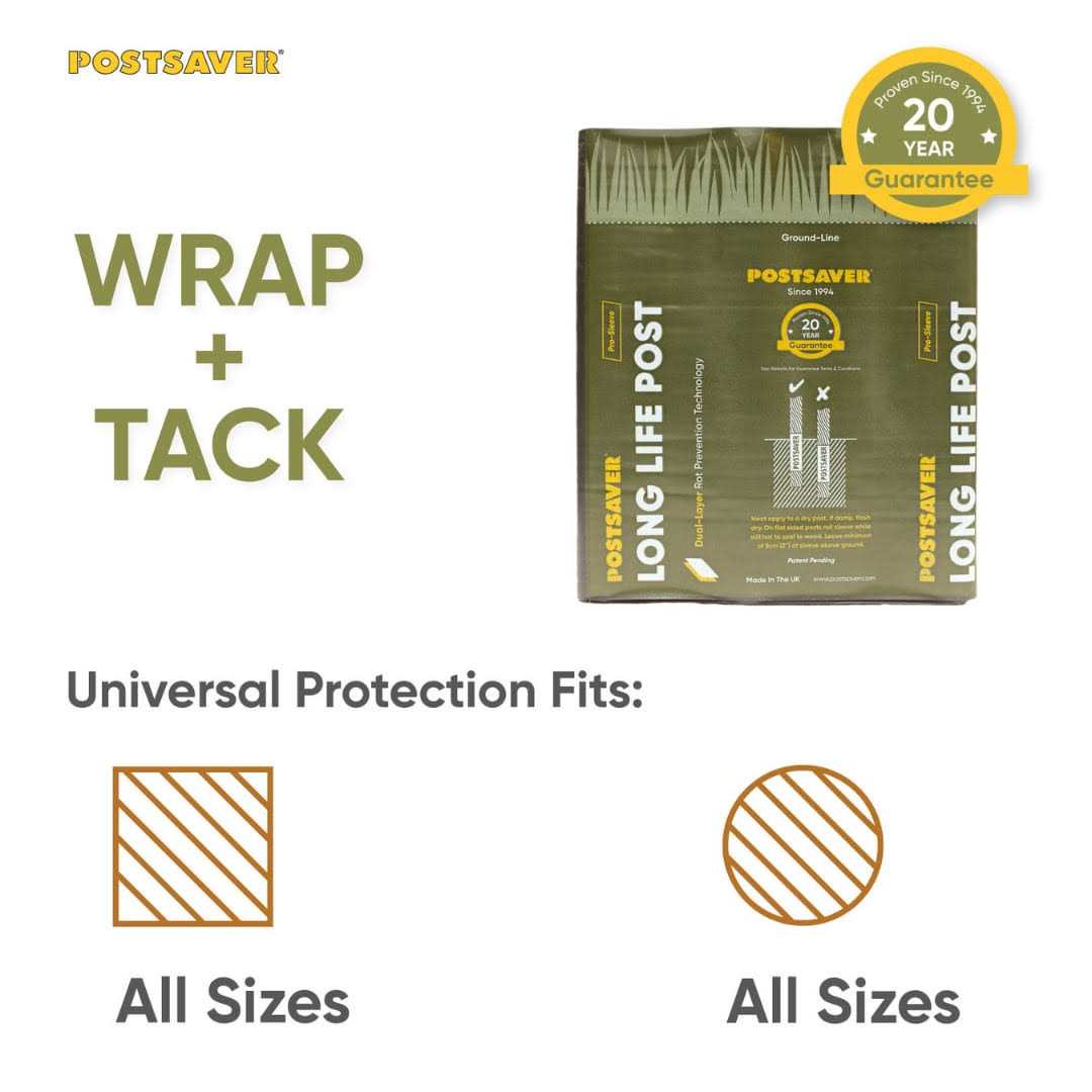 Ground-line rot, decay, fungi and moisture are the number 1 contributor to wood post failures and are found within the first 6 in. to 8 in. of earth surrounding in-ground posts. Post Saver fence post protector sleeves provide a locked-in air and moisture barrier and rot block protection for new wooden posts before installation. Installing this product on your posts will save yourself the cost of replacing your posts every few years. Independently tested and proven to dramatically extend the lifespan of wooden fence and gate posts with a 20-year guaranty. To apply, simply wrap the roll of Postsaver Wrap and Tack around your post ensuring the top 2-in. are above required burial depth, as per instructions. Overlap 1 in. or 2 in. to ensure the post is completely covered. Tack with a hammer staple or equivalent to hold secure and heat shrink in place using a heat source such as a soft flame blow torch, it takes less than a minute to apply. Once you’ve fitted Postsaver protection to your posts, install in the normal way, i.e. dig and back fill, concrete or power drive (even into stony ground).