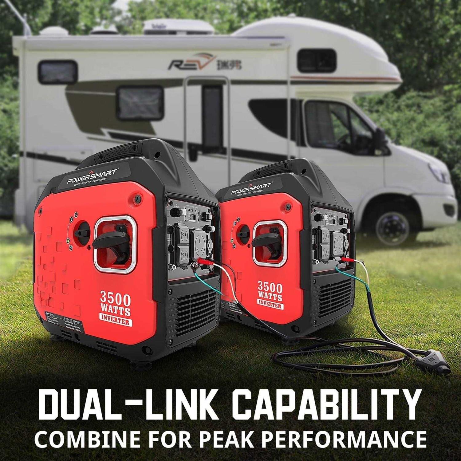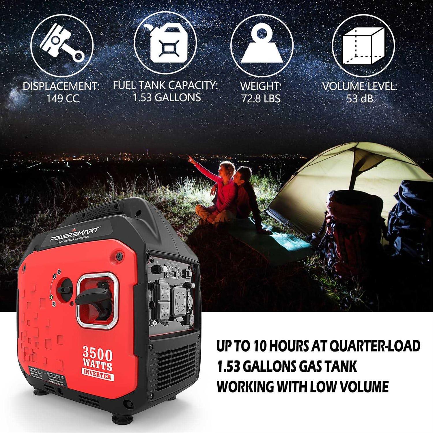 The PowerSmart 3500-Watt Portable Inverter Gasoline Generator is powered by a 4 stroke OHV single cylinder engine and forced air cooling system, providing you with reliable support when you need it. It runs for up to 10 hours on a quarter load. Fully assembled with hassle-free setup, the handy suitcase design is both durable and compact and weights only 48 pounds, giving you the freedom to take it anywhere with ease.The parallel capability allows you to run two of our generators in tandem with the use of a power kit to effectively increase power output without the hassle that comes along with having a much larger unit. 53 dB from 23 feet, making it perfect for quiet camping, RV, and home use, etc. It includes two three-prong 120V receptacles, one 12V DC receptacle, two 5V USB ports.