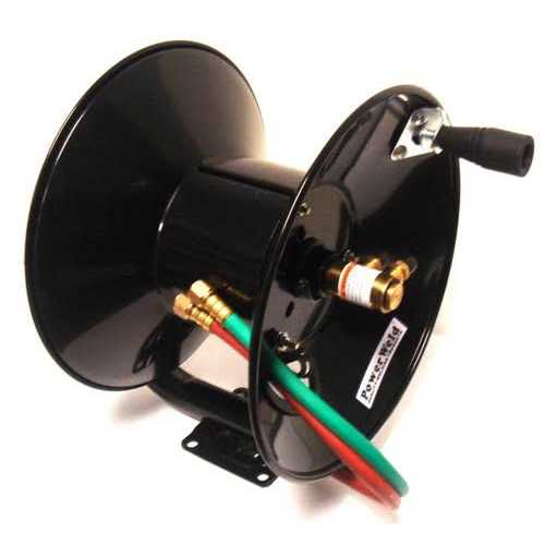 Hose assembly not included 3′ PowerWeld 1/4 Grade ‘T’ connector hose included. Corrosion resistant powder coating Spring Tension Brake keeps the reel from free spinning after you’ve stopped pulling out the hose Solid brass swivel. Mounts on any flat surface . Heavy-duty steel frame construction Working Pressure: 300PSI. Hose capacity 1/4 – 100′ Weight 13 lbs HOSE REEL- MANUAL 100′ TWIN HOSE CAPACITY (HOSE NOT INCLUDED)