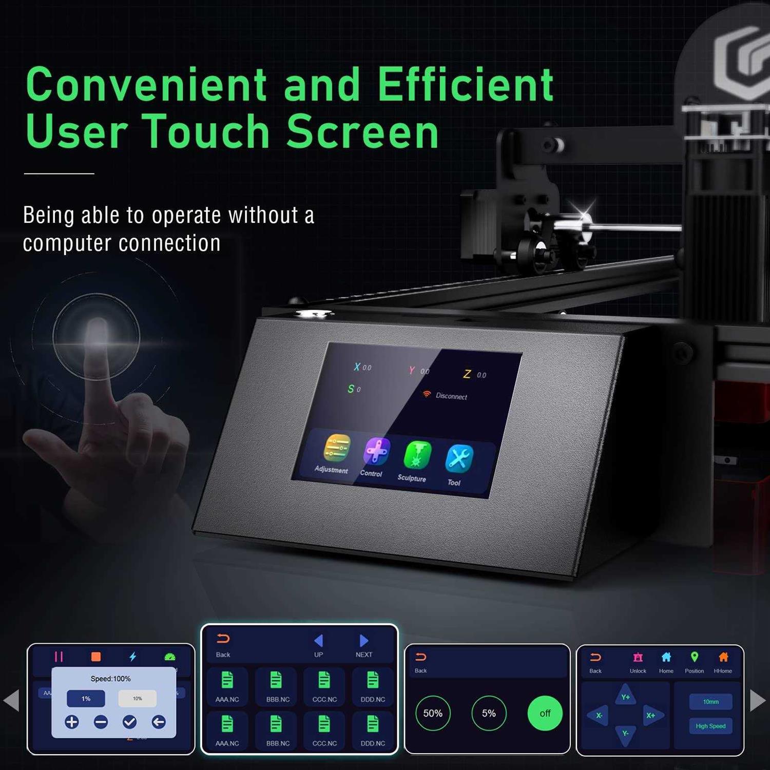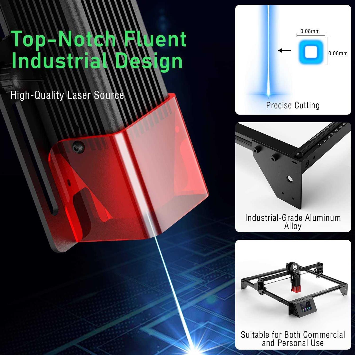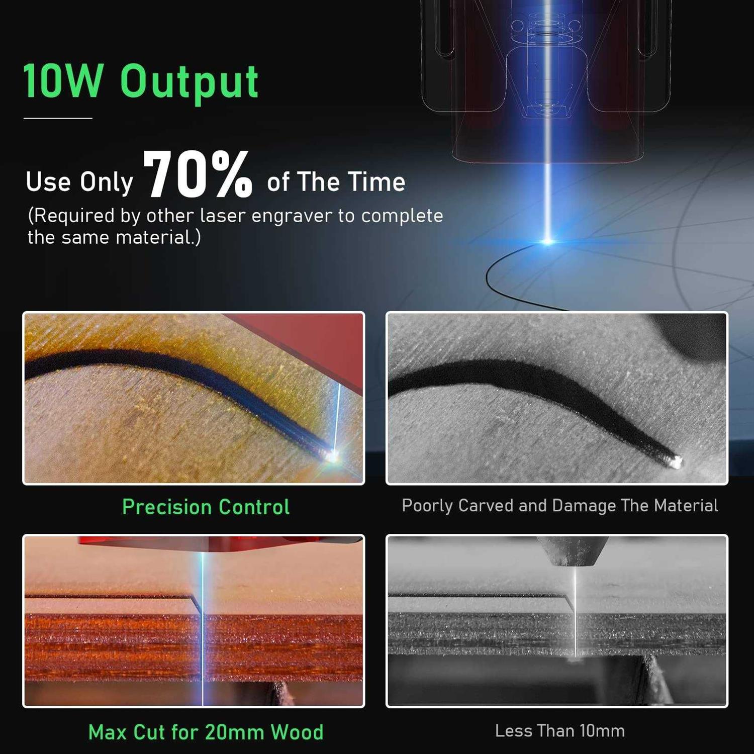 Precision Industrial CNC Machine: Featuring a 3.5-inch touchscreen, the 10W laser engraver has 60W machine power and delivers precise results on various materials like wood, metal, leather, and acrylic. Ideal for artists, designers, and hobbyists, invest in your creativity and experience the precision of our 10W laser engraver today! Efficient Laser Engraving and Cutting: Upgrade engraving and cutting with our advanced laser engraver. Our high-accurate machine features 0.01mm motion precision and a faster speed of up to 10000mm/min. 15.7 x 15.7 inch engraving area is ideal for makers and manufacturers, it completes the same material in only 70% of the time required by other laser engraving machine. Upgraded Materials and Laser Sources: Single diode laser with Fast-Axis Collimator (FAC) featuring a 0.06*0.06mm fixed-focus compressed laser spot, our laser engraver uses blue light semiconductor laser to deliver accuracy and uniformity, making it perfect for wood carving and DIY or commercial. The power of our cutting-edge technology, designed to deliver consistent and high-quality results every time! Safe and Reliable: Aluminum alloy structure ensures durability and safety during use. Not only designed with safety in mind, but it also includes goggles to protect the user’s eyes from the powerful fiber laser. With materials executed in compliance with certification standards and a newly fireproof acrylic cover for flame resistance, you can have peace of mind while operating. Unleash Your Creativity: With a large engraving area of 400*400mm and compatibility with various software and file formats. You can create a variety of items such as personalized dog tags, exquisite handmade gifts, and home festival decorations. Longer laser engraver is perfect for expressing your personality and preferences in a range of creative applications. Supports WiFi connection.