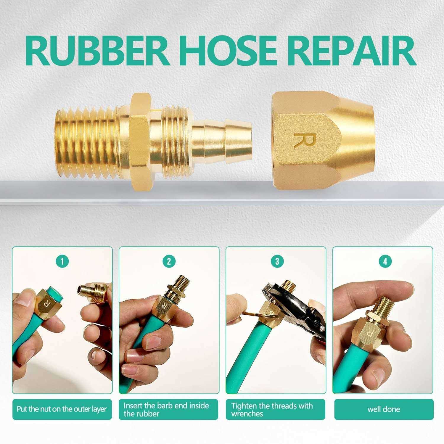 This fitting can help you do this all! 【Material】: Heavy-Duty Solid Brass construction. Durable Brass for corrosion resistance, ductility at high temperatures, and low magnetic permeability. – Maximum pressure rating of 300 psi,Temperature range of -40 to +250 degrees F. With these fittings, hoses can be customized to any length, allowing your jobsite needs to be met. – Durable design means our fittings can be used in any environment, from home garages to professional auto shops. 【Installation】: Prepare follow things:Adjustable wrench, Pipe Cutter and Teflon tape. First, Use the pipe cutter to cut off the broken part, ensuring that the cut is flat. Second,put nut through the air hose and insert the barb end into the hose inside. – Finally use wrench to tighen the nut and fitting. Okay you get a new hose! 【Package Include】: 4Pack 3/8 inch barb x 1/4 inch NPT Hose-End Repair Fitting with 2pcs teflon tape. – 1. Easy to disassemble no flaring tool required. – 2. This fitting is made of brass for corrosion resistance, ductility at high temperatures, and low magnetic permeability. – 3. Fitting body and 1 nuts for splicing damaged hose. – 4. Very easliy to install. – Product matching – This adapter is one kind of repair kit, can suit for plastic hose such PU, PVC,PE or Rubber hose etc. And please know that the OD of rubber hose and PU hose is different, and our rubber repair fitting have a – This fitting can have a good sealing than clamps. /p