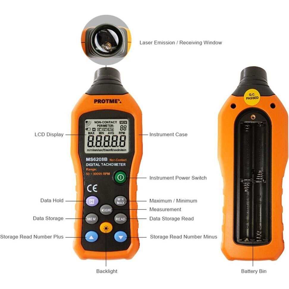 The MS6208A is a contact-type digital tachometer with stable performance, high reliability and high safety performance. Measurement mode: m/min m/sec ft/min ft/Sec in/min. Highly accurate contact digital tachometer with high speed operation and instant readings from 50 to 19999RPM The LCD is backlit to allow making and reading measurements in low light conditions. Functions: Auto Power Off, MAX/MIN/AVG Functions, m/min m/sec ft/min ft/Sec in/min unit selection, 100 groups Data Logging Product Description: The MS6208A is a small handheld portable contact-type digital tachometer which comes with two idler wheels, two touch tips and one extended handle, it measures rotational speed, counter rotating(REV), rotary velocity, linear speed, surface speed, speed of motors, motorcycles, trucks, boats, aircraft, conveyor belts, lawn mower, scooter, tractor, wood lathe and other moving and rotational systems.. The core component of the meter is a compact high-speed integrated chip. The meter will display rotation speeds from 50RPM—19999RPM, rotation speed under 50 RPM display show 0. It also can be described as rotational induction tachometer sensor, automotive tachometer, autometer, RPM reader/rotate speed meter, RPM tester gauge/tool/device/equipment, fan tachometer. Usually contact tachometer take measurements through direct contact with the moving surface, and can test both rpm and surface speed, measure speed on different kinds of rotary systems, it’s an an excellent choice for dirty and dusty environments. Tachometers are used in applications such as automobile maintenance, mechanical engineering, and maintenance of industrial equipment. Please note it’s not a laser photoelectric photo type tachometer. Product Specification: Contact Measurement: 50~19999RPM ±(0.03%+2) Measuring Distance: N/A Auto Power Off: 30S MAX/MIN/AVG Functions: √ m/min m/sec ft/min ft/Sec in/min unit selection: √ Data Logging: 100 groups Data Hold: √ Display Back light: √ Low Battery indication: √ Power Supply: 4×1.5AAA Battery Product Size: 193mm x60mm x 29mm (7.5″ x 2.4″ x l.l “) Product Weight: 120g(0.31b) Category: CE Packing Weight: 300g Packing Size: 189*111*62mm Package include: 1*MS6208A digital anemometer meter 1*User Manual 1*Meter bag