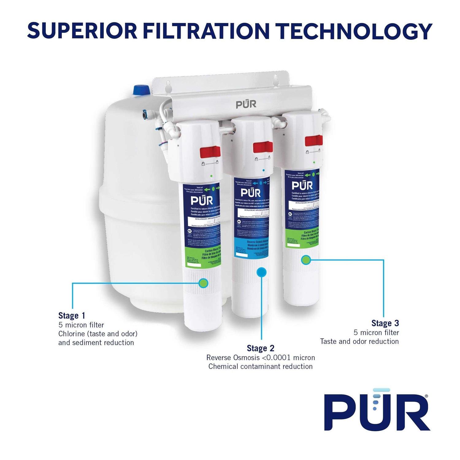 Drink cleaner, refreshing water with the PURÂ 3-Stage Quick-Connect Reverse Osmosis (RO) Water Filtration System. Conveniently install this 3-stage RO water filter system under your sink to deliver more Purified water through a secondary air gap faucet. Make an environmental choice and avoid bottled water, choosing this water filtration system that is NSF certified to reduce at least 15 unwanted contaminants including lead, cysts, TDS and heavy metals. During stage 1, the 5 micron carbon block filter reduces particulates and chlorine. In stage 2, the RO membrane further filters to less than 0.0001 micron, thereby reducing chemical contaminants and improving the safety of your drinking water. In the final 3rd stage, a secondary carbon block filter removes any residual taste that may come from the storage tank. This quick-connect design makes replacing the filters a breeze with a simple flip of a switch and twist of the wrist. For best water filtration system maintenance, replace the carbon block filters every six months and the RO membrane every two years. This water filtration system features a compact, bracket-mounted space-saving design with everything you need for quick and easy installation.