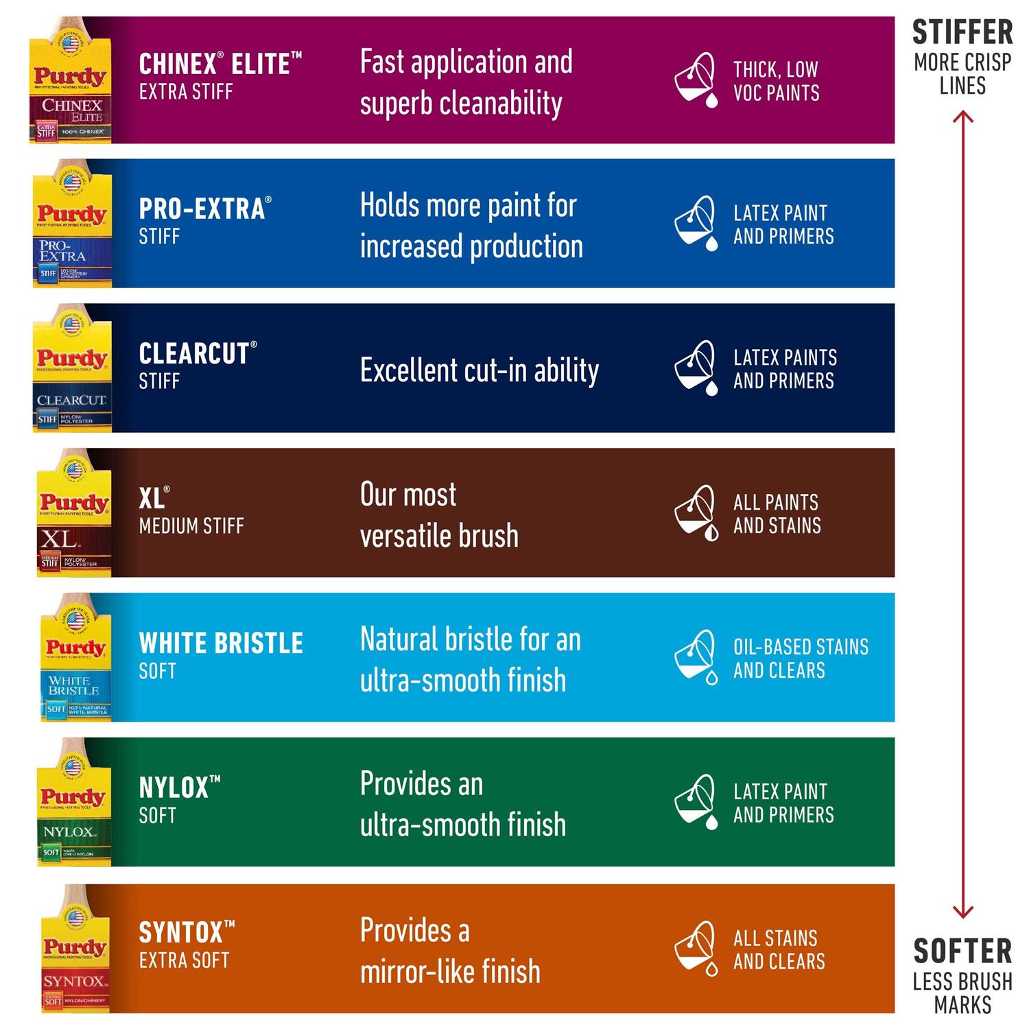 Purdy White Bristle paintbrushes are made with a soft, natural bristle blend that provide an ultra-smooth finish. These brushes are best for oil-based stains, polyurethanes, wood thinners, lacquer thinners and clears. Designed with lightweight and moisture-wicking alderwood handles, this painting tool is made to last. Handcrafted in the USA with global materials. Ideal for decks, siding, floors, furniture and antiques.