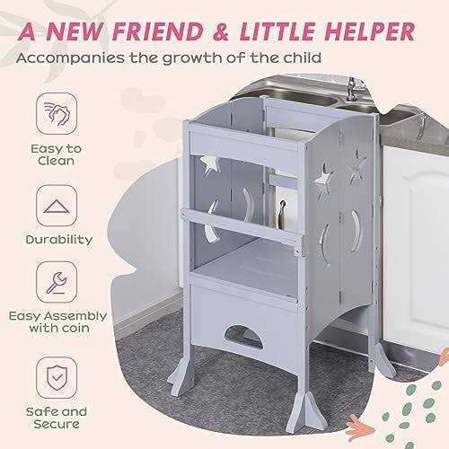 Build your child’s confidence with Qaba kids step stool, an aid to their adventurous spirit. Designed for little ones with the ideal height to reach new heights effortlessly. Embrace safety with 4-sided rails and a non-slip pad to ensure fearless exploration. Our step stool has a sleek folding design that is compact and easy to store. Its sturdy structure can withstand their energetic curiosity. Let them conquer new territories in style and safety, making every moment a triumphant step forward. Features: An ideal tool to help children acquire a certain height The pine frame makes the kitchen stepping durable Can be used in any room including the kitchen, study room, bedroom, hallways, etc Anti-skid pad is to prevent slipping and losing balance. A gated guard rail is used to protect your child from falling through the middle With a foldable design, this kitchen stepping will not take up space Specifications: Material: MDF, Pinewood Color: Elephant Grey / Natural Overall Dimensions: 22″ L x 22″ W x 36.5″ H Step Dimensions: 17.25″ L x 15″ W Off the Ground: 16.25” Certifications: ASTM F963, CPSIA Suitable Age: 3-8