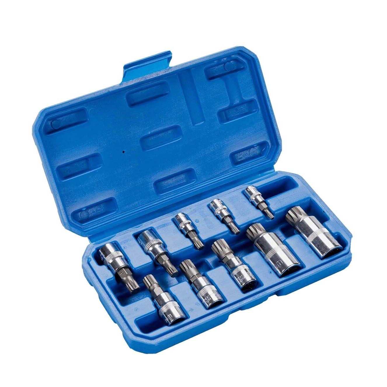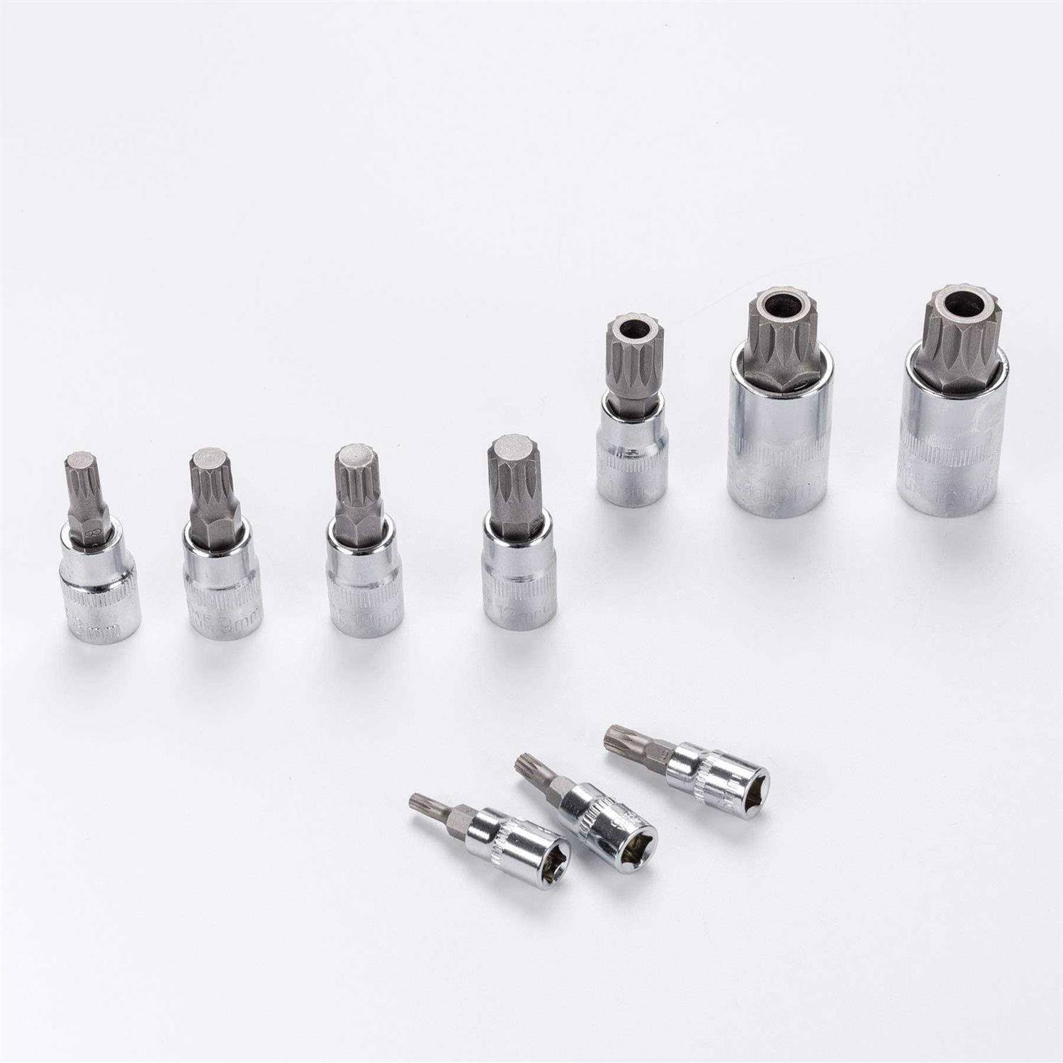 Crafted and Designed with superior materials for increased torque and unmatched hardness. Torx Bits: Drop-forged, Heat-treated S2 alloy steel, known for its supreme hardness (60-62 HRC). Zinc Phosphate finish reduces any wear-outs and ensures longevity through multiple usages. Drive Sockets: Heat-treated Chrome Vanadium Steel, hardened to increased torque power. Fully polished, Chrome plated mirror finish for complete rust and corrosion resistance. Package included: 10 x Spline Bit Socket 1/4” Drive: M4, M5, M6 ( L 37mm ) 3/8” Drive: M8, M9, M10, M12, M14 (Tamper Proof) ( L 48mm ) 1/2” Drive: M16 (Tamper Proof), M18 (Tamper Proof) ( L 55mm ) 1 x blowing mould case