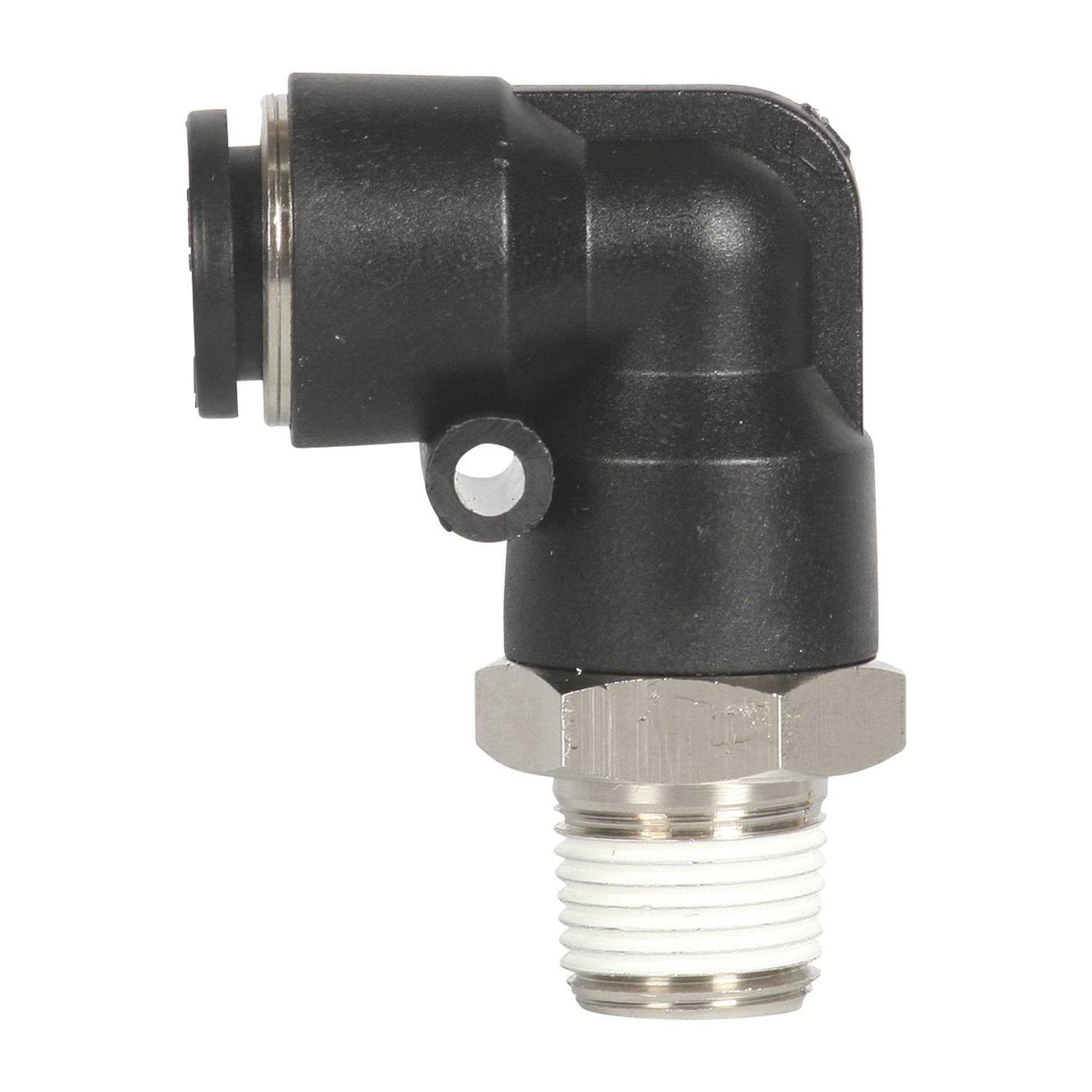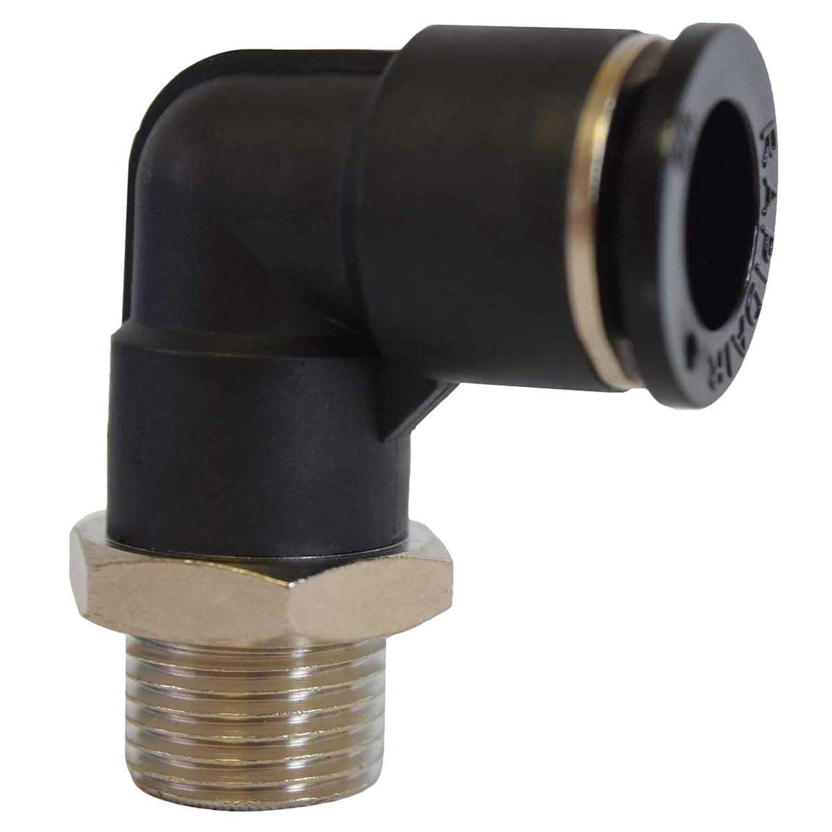 The Rapidair 1/2 in. tubing x 3/8 in. Male NPT Elbow adapter fitting, features a push to connect style to make fast and easy connections. There is no glue, soldering or crimping needed. Simply cut the tubing to length and insert the tubing into the fitting. Tubing can be released by push button if desired.