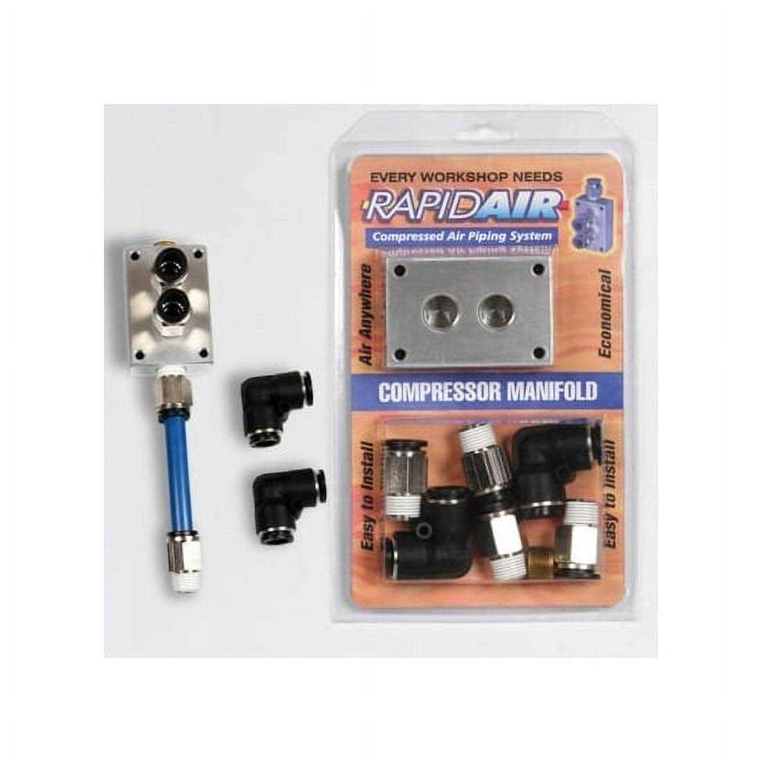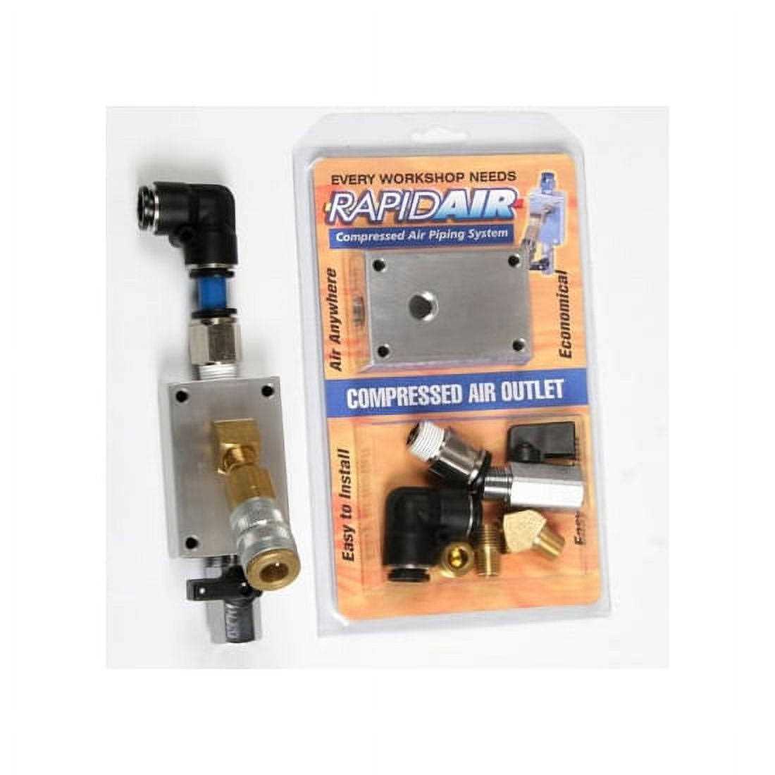 Make sure this fits by entering your model number. Kit includes: 100 ft. of 1/2 in.Tubing, (2) Air Outlet Kits and (1) Compressor Manifold Kit, Quick couplers pictured sold separately 150 psi maximum working pressure, 1/2 in. outside diameter x 3/8 in. inside diameter Push to Connect fittings Recommended usage 50 ft. maximum from the air compressor, up to 1200 sq. ft. buildings, up to 5 hp air compressor Use only with Rapidair 1/2 in. OD x 3/8 in. ID nylon tubing system Product description Set up a compressed air system with the 1/2 in. Rapid air Master Kit with 2 air outlet locations. Single layer nylon tubing can be mounted on wall surfaces or in wall. No glue, soldering or crimping needed. Simply cut the tubing to length and insert in the fitting. Tubing can be removed from the fitting with a push of the outer button. Easy to expand with more air outlet locations or modify later.