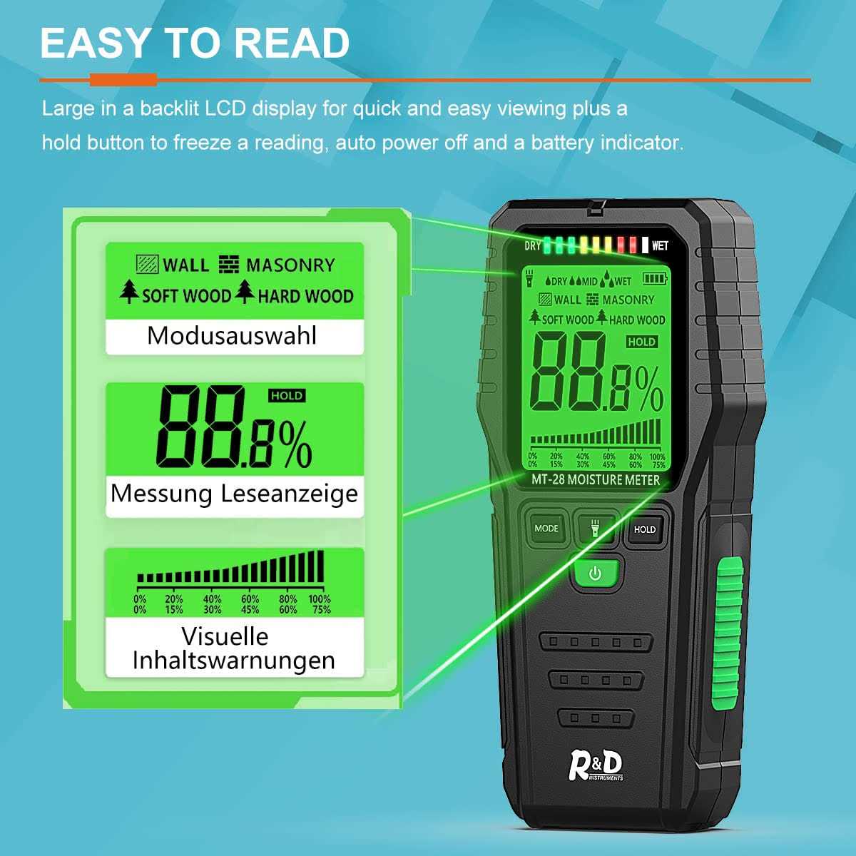 RDINSCOS Pinless Wood Moisture Meters Water Leak Detector for Lumber Concrete Building -Wall Moisture Sensor Digital Humidity Tester
