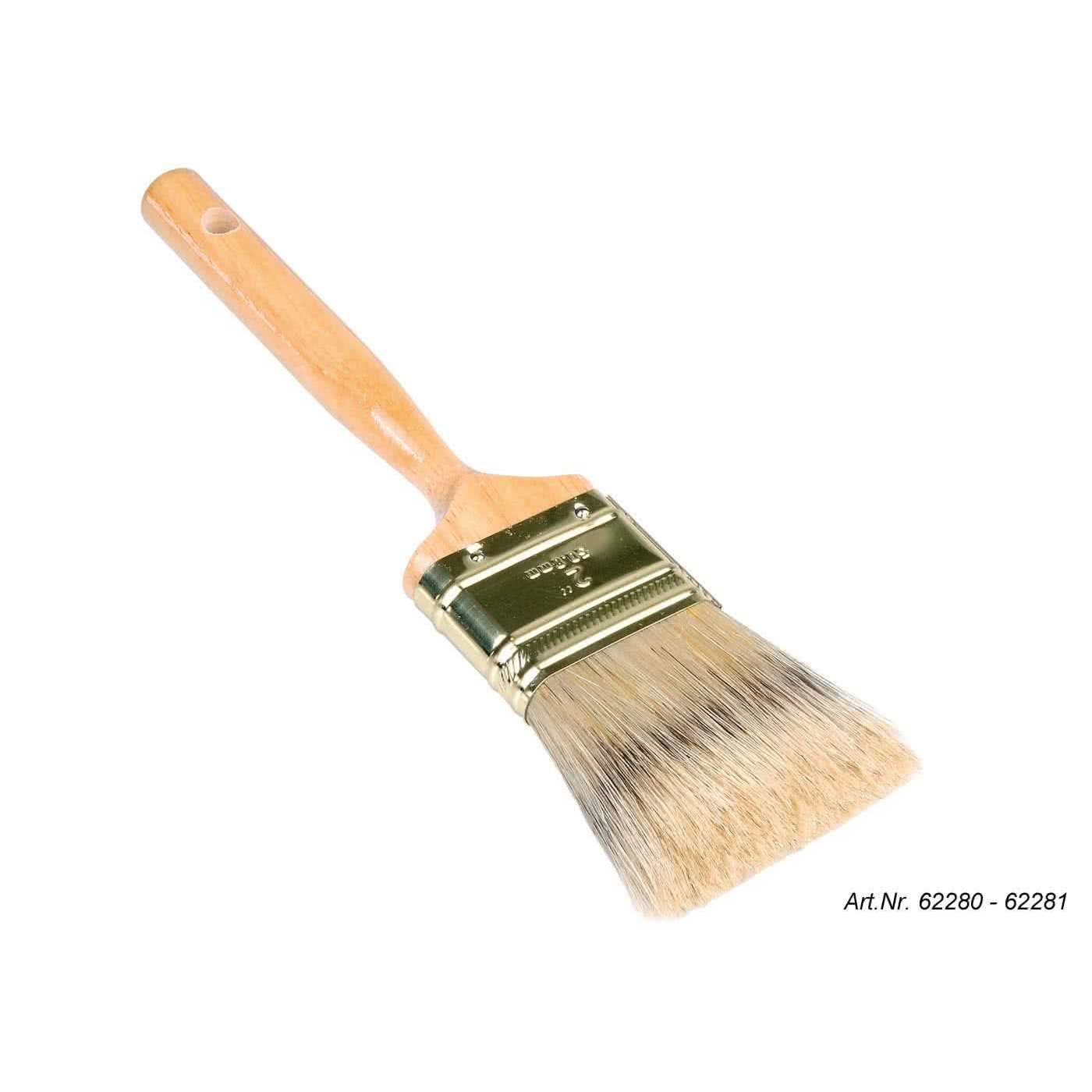 Redtree Industries’ Badger style brush is handcrafted with 100% natural bristle, making it a top choice for oil-based paints, stains, varnishes, urethanes and shellac. Wooden handle with rounded contours provides excellent balance and deft touch, while the thick head of bristles holds a generous amount of finish for extra-smooth flow and even leveling. Chisel trim allows you to cut in sharply and cleanly. Made in USA.Each brush has a convenient hanging hole.1″ brush measures 7-3/4″ long overall. It is approximately 1/2″ thick.2″ brush measures 8-5/8″ long overall. It is approximately 5/8″ thick.3″ brush measures 9-1/4″ long overall. It is approximately 3/4″ thick.