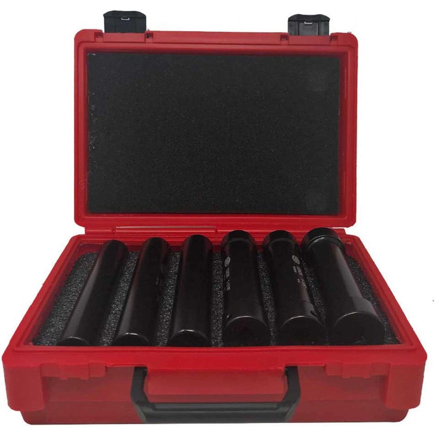 Features: Extended length (6″ and 6½”) impact grade sockets. EDSK6 includes six different sizes of extended sockets in a heavy-duty case. Perfect for hard-to-reach deep well bolts. Drive them with a 1/2” square drive impact wrench or hand tighten. Six-point sockets provide maximum contact to support heavy work. Details: For hard-to-reach deep well bolts, extended sockets are made of tool steel and are impact grade. Use extended sockets to tighten hex nuts on repair clamps, mechanical joint fittings, and saddles. Drive with impact wrench or hand tighten. Finish on sockets provides corrosion-resistance. Kit includes six extended sockets in a portable, heavy-duty case.