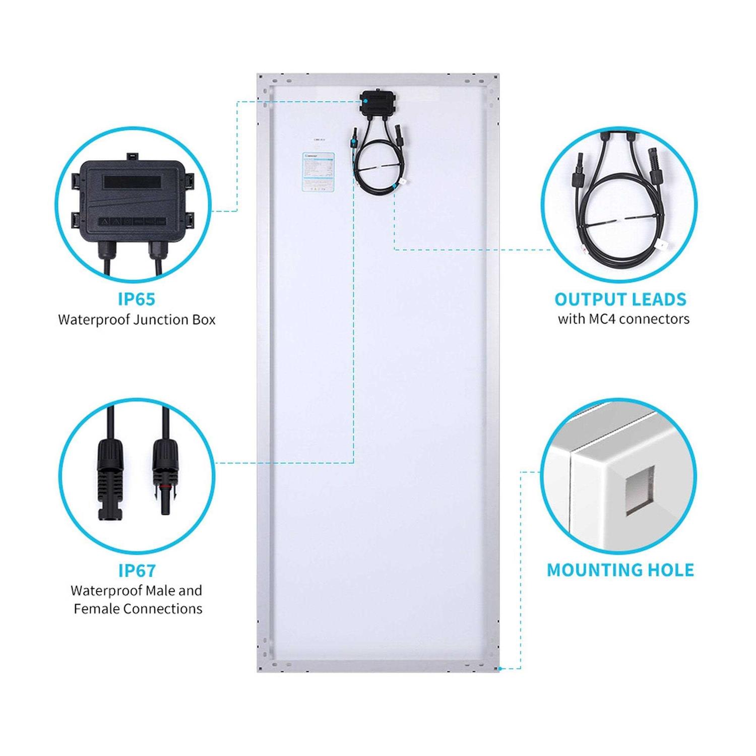 - 【Reliable】Bypass diodes minimize power drop caused by shade; TPT back sheet ensures smooth performance over a long period of time