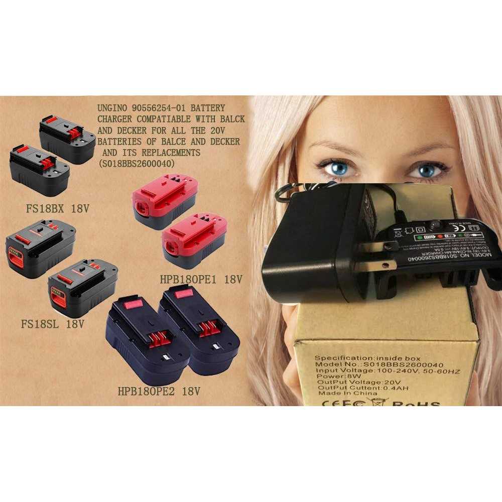 Widely compatible: compatible for Black + Decker 9.6V 12V 14.4V 18V NiCad & NiMh Battery FS12B, HPB12, FS120BX, FSB14, HPB14, FSB18, FS18SBX/ 90501196, HPB18,HPB18-OPE, HPB96,FSB96, 90534824.etc batteries of cordless Power Tools. Perfect quality:due to good materials and good technology/design,so it owns a very good quality . Safety and Reliable:due to unique professional design,it owns a good safety system.it will protect charger from over-charging,over-voltagge,over-heat,over-current. High efficency:it completes charging usually in 10 hours,even 7 hours, Led indicator will help user to master the status of charging when it works. Comply with FCC RoHS and CE security testing standards. any question you can send us e-mails through Amazon UNGINO S018BBS2600040 Charger br 9.6V 12V 14.4V 18V Multi-Volt Charger for Black&Decker 9.6V-18V br Slide-Pack Battery br Fit Black Decker Charger ITEM: br for Black Decker 9.6-18V Slide-in Charger 90556254-01 90592360-01 br 90571729 br Fit Blacke Decker 9.6-18V Slide-in Battery ITEM: br for Black+Decker 9.6 Volt NI-CD/NI-MH Battery FSB96 HPB96 FSB96BX br for Black+Decker 12 Volt NI-CD/NI-MH Battery HPB12 FS120BX FSB12 br FS120B A12 A12-XJ A12EX A1712 br for Black+Decker 14.4 Volt NI-CD/NI-MH Battery FSB14 HPB14 FS14BX br FS140BX br for Black+Decker 18 Volt NI-CD/NI-MH/Lithium Battery HPB18 HPB18-OPE br FSB18 FS18BX FS18SBX FS180BX FS18C FS18FL 244760 HPB18-OPE2 br HP188F A1718 A18 br UNGINO 9.6-18V Charger Advantages: br 1. Low cost, works well. Just slide this on the black decker battery and plug it in br and done. br 2. Best of the B&D slow chargers, battery full charged time is 7-10 hours. br 3. It seems like our black decker replacement charger last longer as compared br to the older charger. br 4. Works better than old unit – turns off instead of overcharging. br 5. LED indicator: Particularly like the fact that the charger has a light to let you br know when the battery is fully charged. br 6. Compact design (3.68-4.13″ Long, only 0.30 lbs.) is ideal for jobsite br portability and storage. br 7. Spare charger: Like to keep a spare one in case it is needed. br LED Indication Light: br Red: charging is running br Green: charging completed, battery full br Product Details: br Product Type: Replacement Black Decker 9.6V to 18V battery charger br Input: 100V – 240V br Output: 9.6V-18V br Color: Black br Exclude: Battery is not included br Package Includes: br 1 X9.6-18V Battery Charger Compatible with Black and Decker 9.6V 12V br 14.4V 18V Slide Pack Battery br
