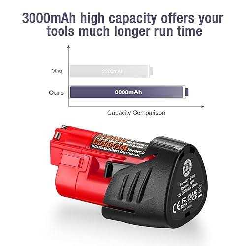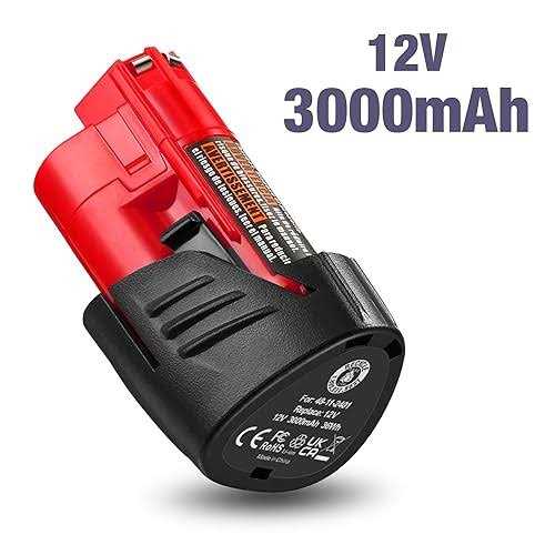 Capacity: 3000mAh; Battery Type: Li-ion; Voltage: 12V; Wattage: 36Wh 【Compatible with】:This replacement battery compatible with all Milwaukee M- 12 Cordless Power Tools,Replace for 48-11-2401, 48-11-2402, 48-11-2420, 48-11-2430, 48-11-2440, 48-11-2460, 48-11-2411, 48-11-2412 etc.Same as the Original OEM Battery. 【Reliable and No Memory Effect】:This replacement battery is made of high-performance lithium battery cells ensure that all batteries are efficient, reliable, safe and high quality. No memory effect, can be charged or discharged without losing capacity. 【Safe to Use】:This replacement battery is CE, FCC & Rohs certified and tested by manufacturers to match OEM products. Intelligent Protection against potential damage caused by over-charging, over-discharging, over-voltage, over-current, short-circuit. Feel free to use.”