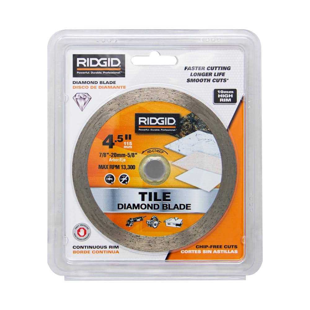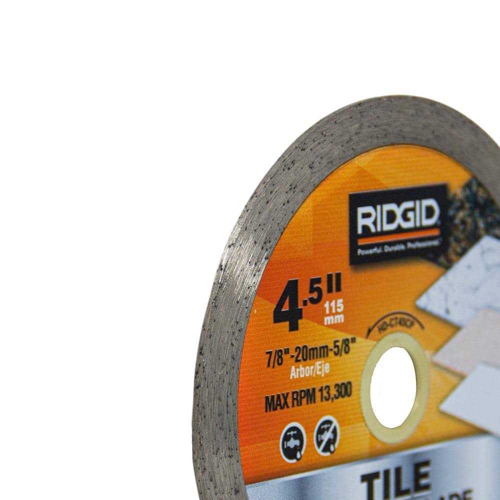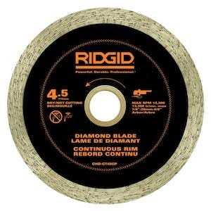 RIDGID Continuous Rim Diamond blades are engineered with top-grade industrial diamond for maximum cutting performance and superior blade life. With its high retention and uniform distribution of diamond particles throughout the cutting segment, these blades provide precise, chip-free and fast cutting of tile, marble, granite and other natural stone. 4.5 in. blade will fit 4.5 in. angle grinders with a 7/8 in. arbor, 5/8 in. and 20 mm adapters are also included. Suitable for both dry or wet cutting conditions.