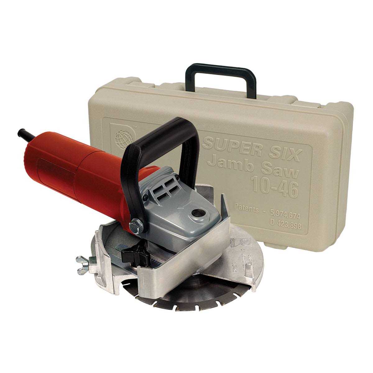 The Super Six 6″ Jamb Saw is a powerful and versatile tool capable of meeting a wide variety of undercutting needs. With a big 6-3/16″ carbide tipped blade this saw easily cuts door jambs baseboards cabinet toe kicks inside corners and most hanging doors. The blade height adjusts from flush to the floor to 1-1/16″ to allow proper heights for all floor coverings from sheet vinyl up to thick ceramic and wood.