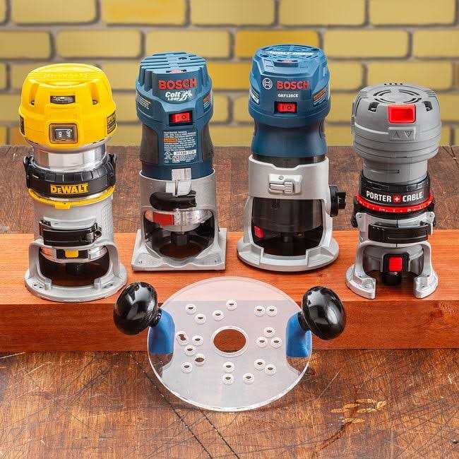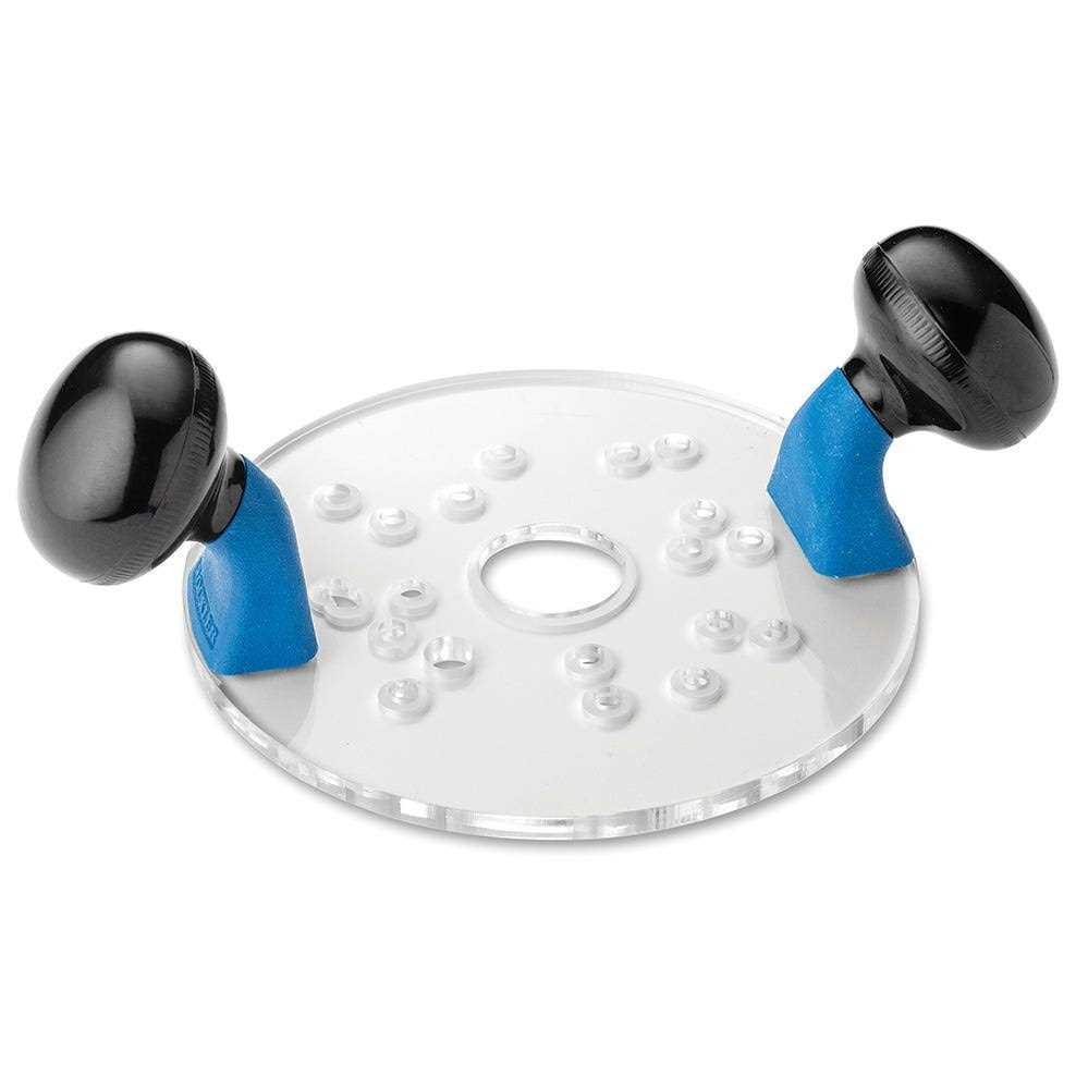 This replacement palm router baseplate provides improved stability and control over the small baseplates typically provided with palm routers. Thanks to its larger 6” diameter and integral handles, it lets you apply ample inboard pressure when edge routing. The baseplate is made of clear acrylic for visibility. It accepts standard Porter-Cable style guide bushings. This NOT work with the new Bosch colt model (#57485) Will this baseplate work with my router? Pre-drilled for the following routers: Bosch DeWalt fixed-base compact routers Porter-Cable | Rockler Compact Router Sub-Base with Handles