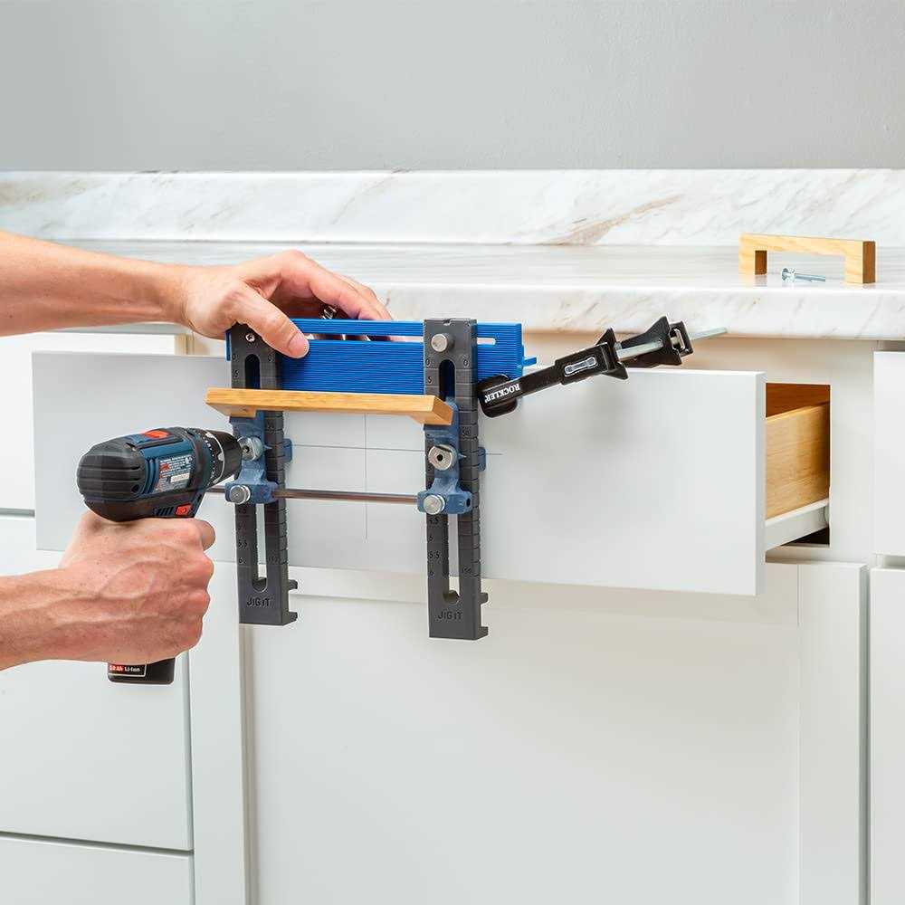 Hardware Jig for Handles & Knobs: An invaluable drill guide tool for the cabinet installer. Our jig-it knob & portable drill guide ensures accurate hole spacing by using the actual pull for setup and stops by providing efficiency & repeatability.. Hardware Jig for Handles & Knobs: An invaluable drill guide tool for the cabinet installer. Our jig-it knob & portable drill guide ensures accurate hole spacing by using the actual pull for setup and stops by providing efficiency & repeatability.. Utility Tool for Many Works: The patented design of our hole drill guide helps eliminate drilling mistakes. A multi-purpose template tool for all kinds of pulls/knobs/handles installation on doors, drawers, and cabinets.. Easy Installation: Installing with our drill bit guide tool is a breeze! Simply attach the horizontal jig pull to the two drilling guides, tighten the knobs, and drill. The cabinet jig guides are fully left and right, as well as up and down, and an extendable stop can be set for repeatable drilling. This stop can extend from either the left or right of the jig.. Drill Jig Pack Includes: The pull pro-drilling door knob jig guide includes (1) Rockler Knob and Pull Pro Drilling Guide, (1) 3/16 Split-point drill bit, and (1) Hex Key. The fastest and most accurate adjustable punch locator drill template guide tool which is easy to use and easy to set up for any length..,,Rockler