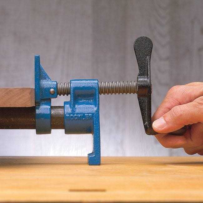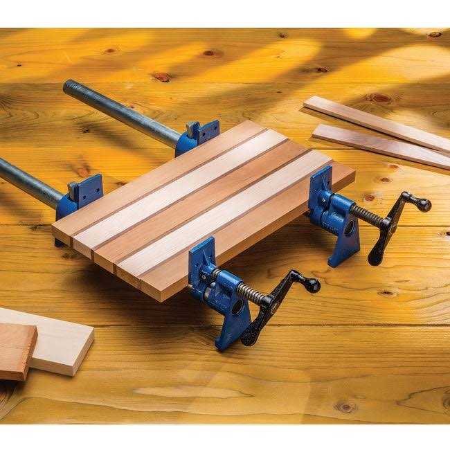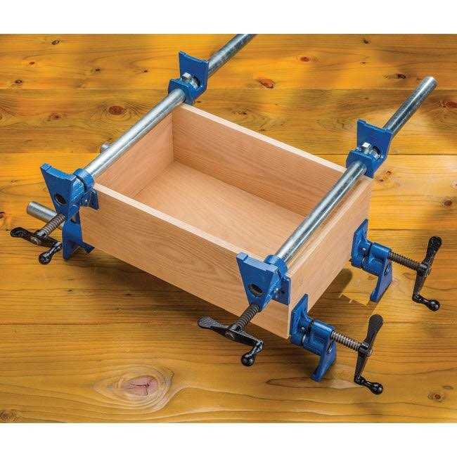 Tall jaws provide a full 2-1/4” of throat depth (#35359, sold separately), which provide a full 1” of engagement with the workpiece on the lower set of clamps. IMPORTANT NOTE: Pipe not included. Fits standard 3/4” NPT pipe (approximately 1” OD x 3/4” ID). Clamping face clamp has pre-drilled holes for mounting pads, cauls, jigs, and specialty fixtures. Built-in wall pipe clamp hook for easy, secure hanging on the wall-no need to close the rockler clamps. Quadruple clutch plates provide a secure, no-slip lock for the tailstock on standard 3/4” pipe.