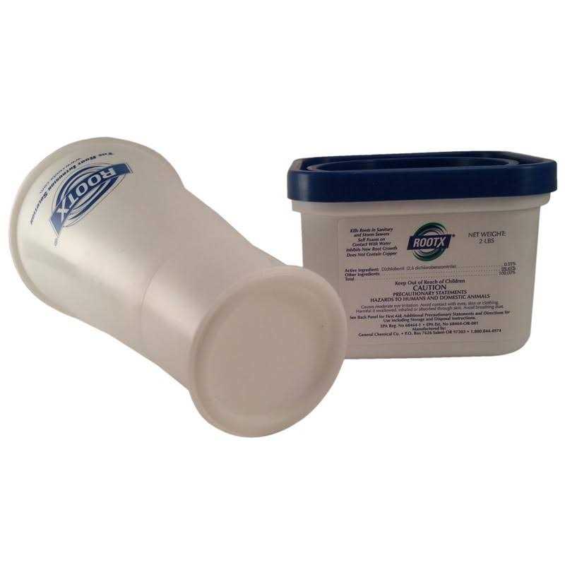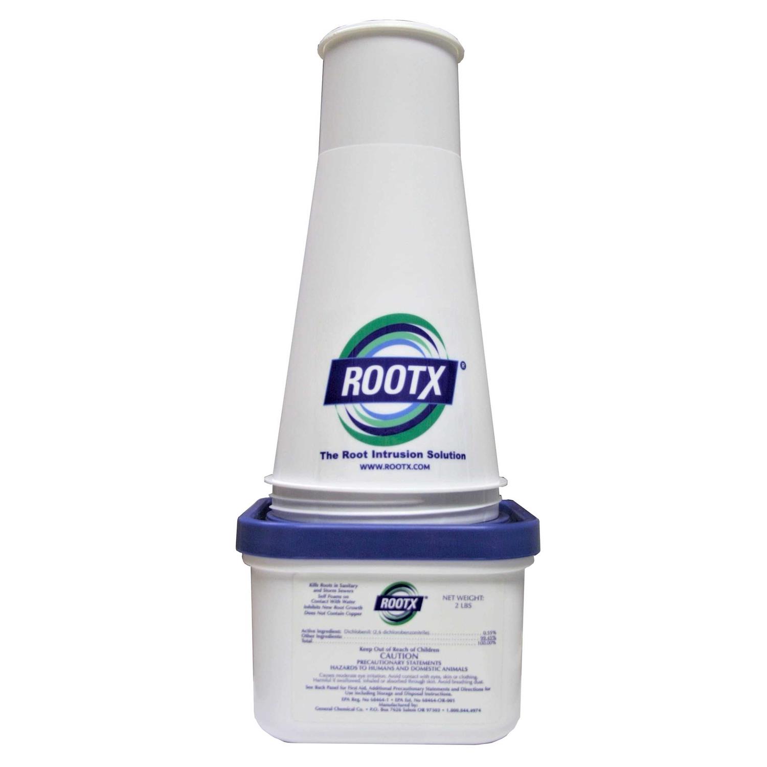 This 2 pound container of RootX is packaged as two dry powder components in one container. When these components come in contact with water they create a sticky foam that fills the entire pipe, coating the roots and pipeline surfaces with the RootX formula. RootX leaves a residual above the water line that continues to kill roots and inhibits new growth for up to 12 months.