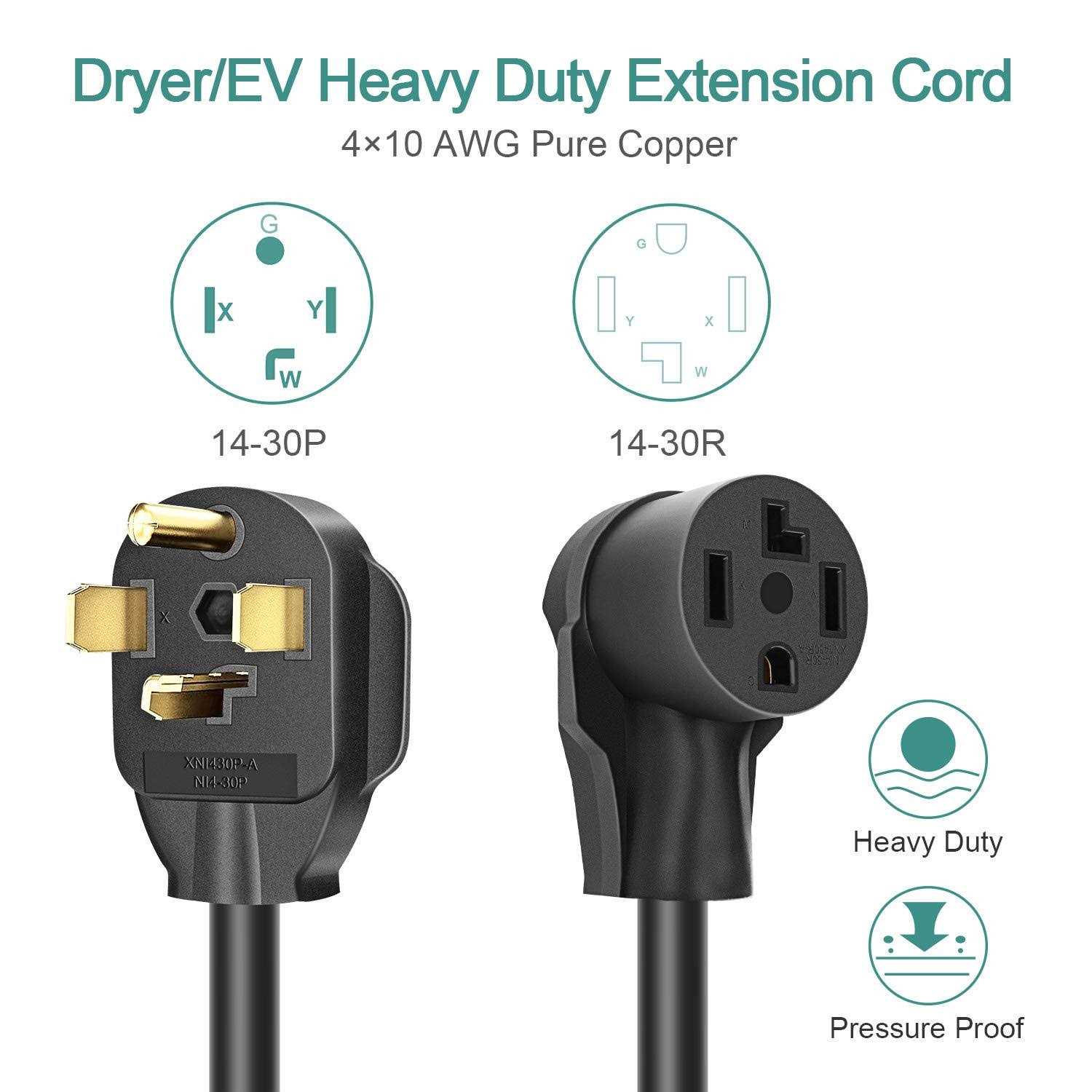 【Dryer & EV Power Extension Cord】: Used to charge your electrical vehicle, relocate your dryer and for other 220 Volt appliances. Make your dryer or electrical vehicle have more moving space for added convenience and flexibility. No need to hire an electrician to install a new outlet or EV wall charger. 【SAFETY ASSURANCE】: 10 AWG 4 Conducor heavy duty cord made of copper with PVC in UL 62 standard for heat-proof insulation and antioxidants, and plug in UL 817 standard support. 【HIGHT QUALITY MATERIAL】: 600Volt thermoplastic STW Jacket and 10 AWG (American wire gauge) x 4C all-copper wires with 14-30 NEMA plug, features excellent abrasion, oil and moisture resistance and flexibility. It should last for a long time even with rugged use. 【Produc Specification】: 30A, 125/250V, max wattage 7500 watts, 25 feet,STW power cord with 14-30P male plug and 14-30R female receptacle. UL/cUL approved. 【Why Choose Us】: Rophor specializes in the production of various adapter power cords. 100% of the products have been rigorously tested to ensure that each product received by our user can work perfectly. Important Note: /b br The plug of the dryer extension cord is 4 prong NEMA 14-30P, and the socket is NEMA14-30R. Please refer to the picture carefully.