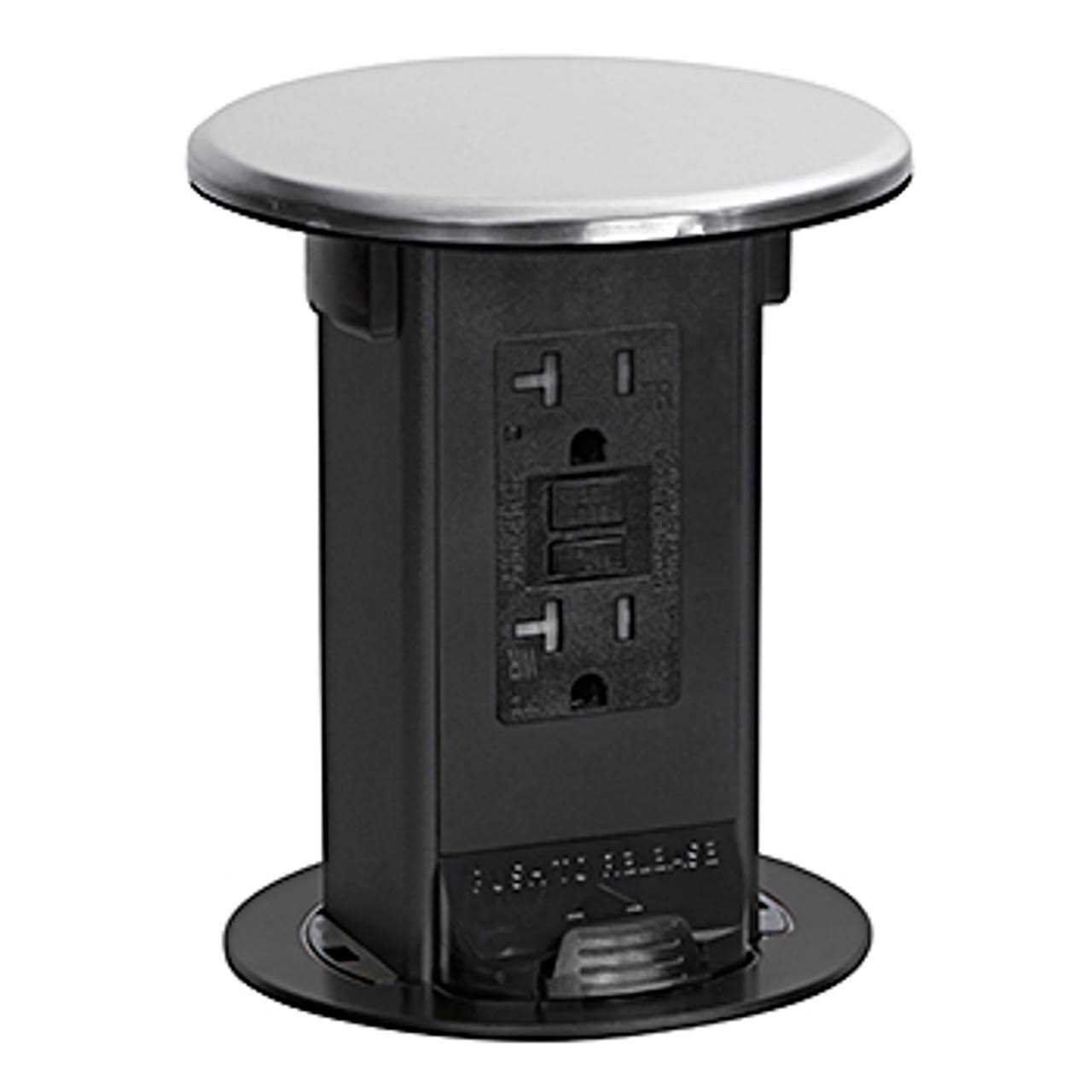 Lew Round countertop pop-up GFCI receptacle has current rating of 20-Amps. The 5-5/8-Inch tamper-resistant receptacle features stainless steel construction. It has cutout size of 3-3/4-inches and 9-ft power cord. It is perfect for use in kitchen countertops, desktops, tables and similar surfaces.
