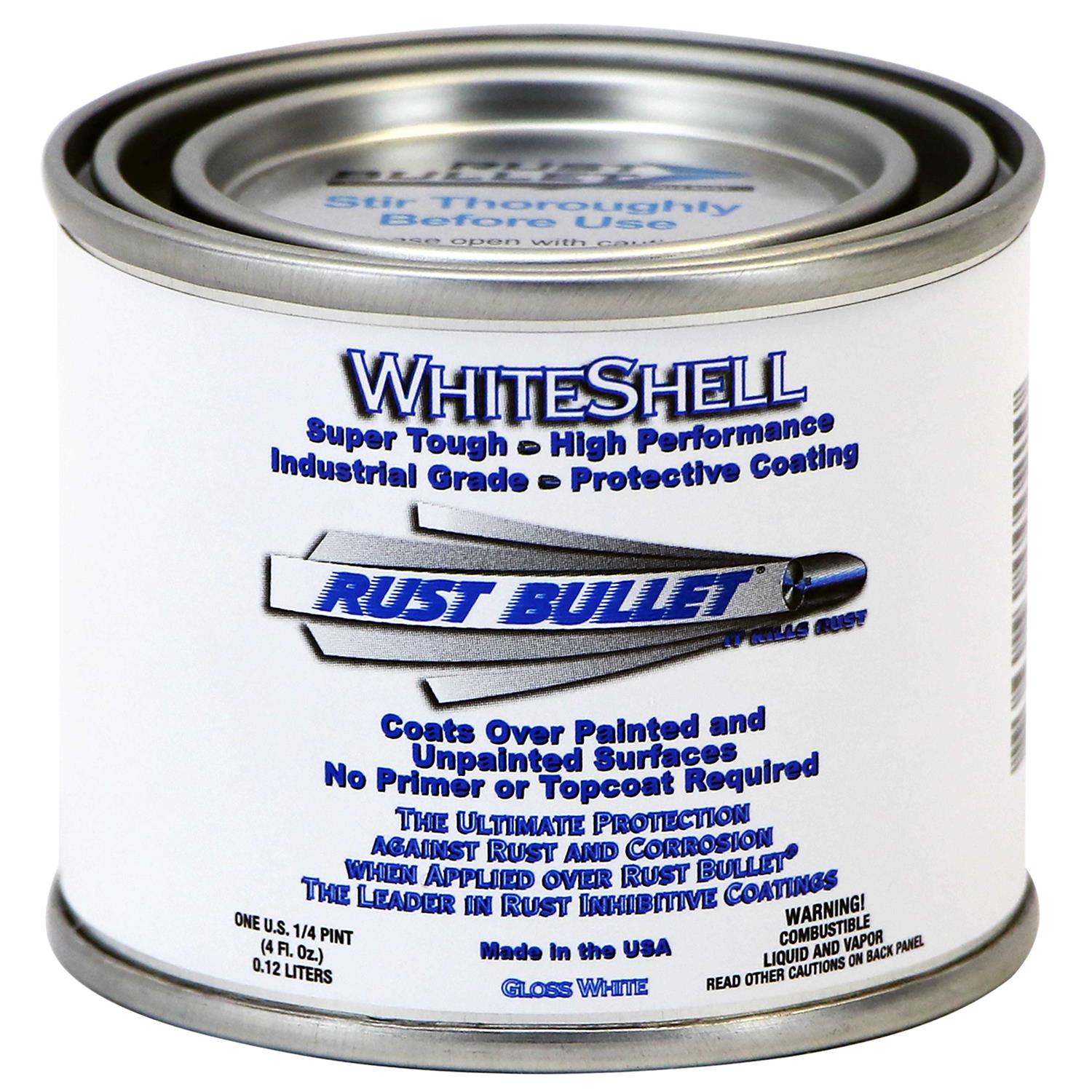 Rust Bullet WhiteShell Rust Inhibitive Coating 1/4 Pint Can 24/Case – WSQP-C24 WhiteShell can be applied over painted or unpainted surfaces and can be used as a stand-alone protective coating that will protect your iron and steel. For the ultimate protection, simply apply WhiteShell as a topcoat over the patented Rust Bullet Standard or Rust Bullet Automotive Formulas to create the strongest armor tough, chip resistant protection against rust and corrosion ever formulated. WhiteShell is UV Resistant, scratch and chip resistant. Rust Bullet WhiteShell dries to a gloss white finish. Rust Bullet WhiteShell can be brushed, rolled, or sprayed. Covers approximately 12 square feet per coat. If used as a stand-alone protective coating, minimum 2 coat application required.