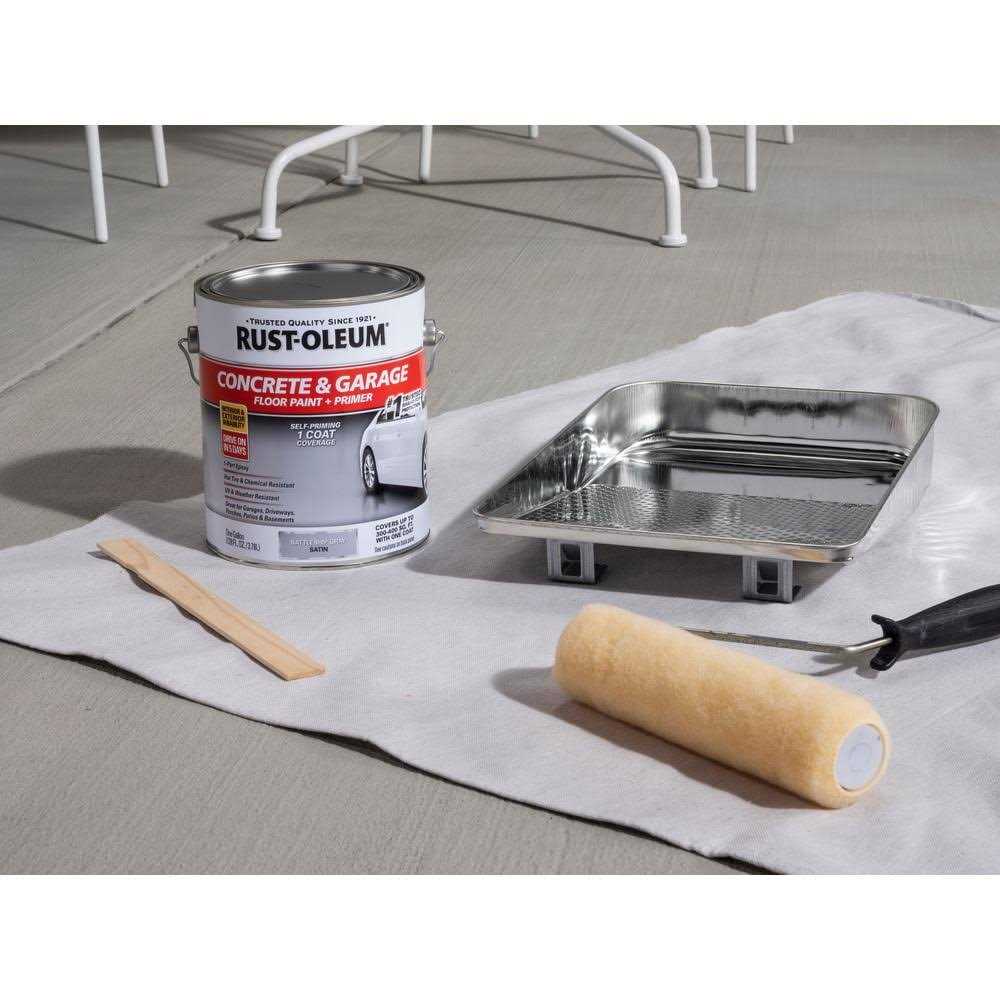Freshen up your concrete floors with Rust-Oleum Concrete and Garage Floor Paint. This self-priming acrylic paint requires only one coat and resists fading, chipping and stains, even when exposed to sunlight, weather, hot tires or chemicals.